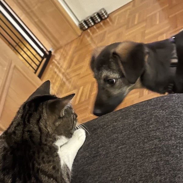 An die Katzen hat sie sich schnell gewöhnt und ist ihnen entspannt gegenüber.