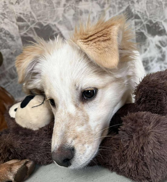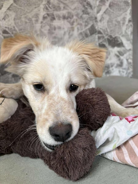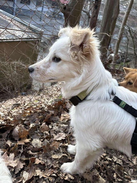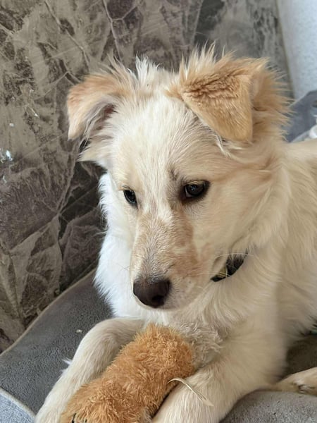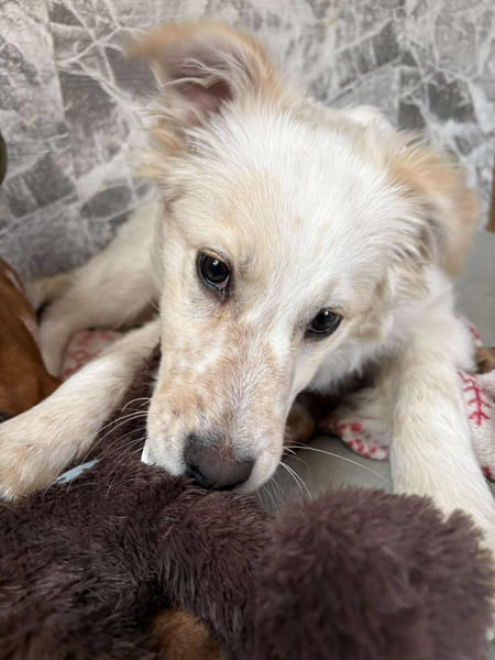 Flint spielt sehr gerne mit seinen Geschwistern und auch mit den anderen Hunden unserer Tierschützerin. Er liebt es sehr, bei den Hunden zu sein.