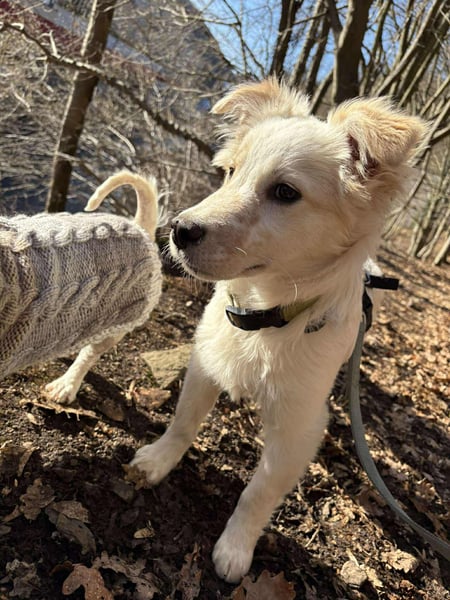 Flint läuft schon ordentlich an der Leine. Wenn er nach draußen muss, um sein Geschäft zu verrichten, meldet er sich bereits.