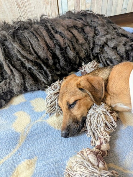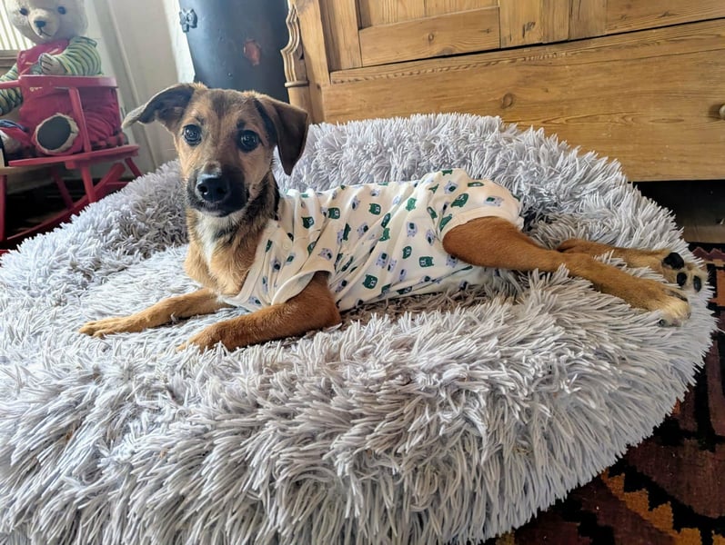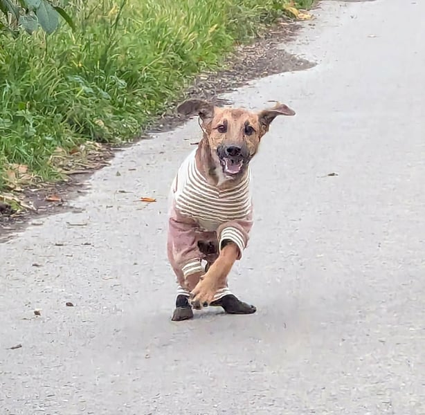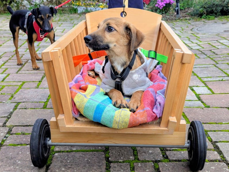 Die kleine Hündin wurde im August 2025 hilflos gefunden. Nach ersten Untersuchungen war klar, dass sie am sogenannten Frosch-Syndrom leidet – einer neurologischen Beeinträchtigung, die dazu führte, dass sie sich anfangs überhaupt nicht bewegen konnte. Schnell wurde ebenso deutlich, dass Tapi im Tierheim keinerlei Chance auf die notwendige intensive Betreuung und Förderung gehabt hätte.