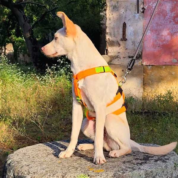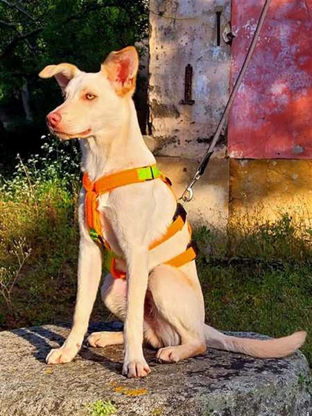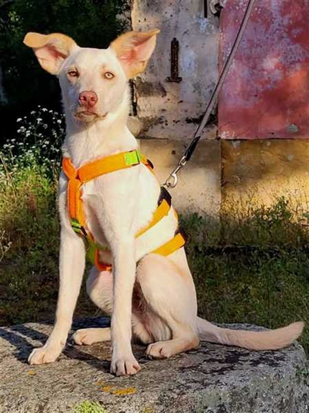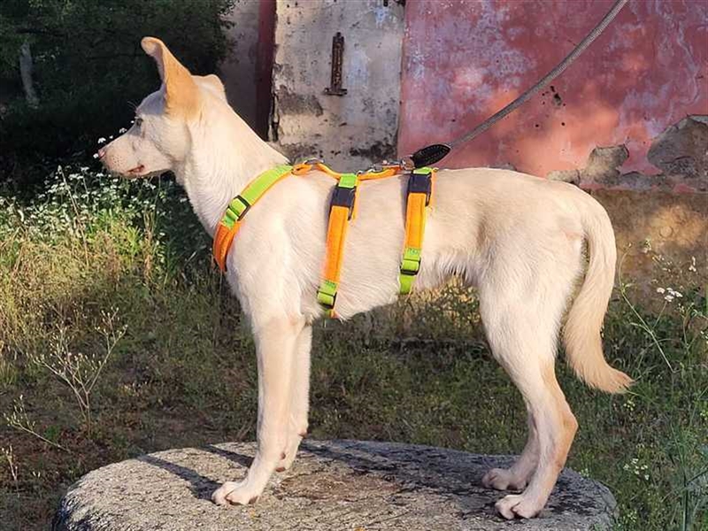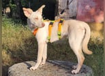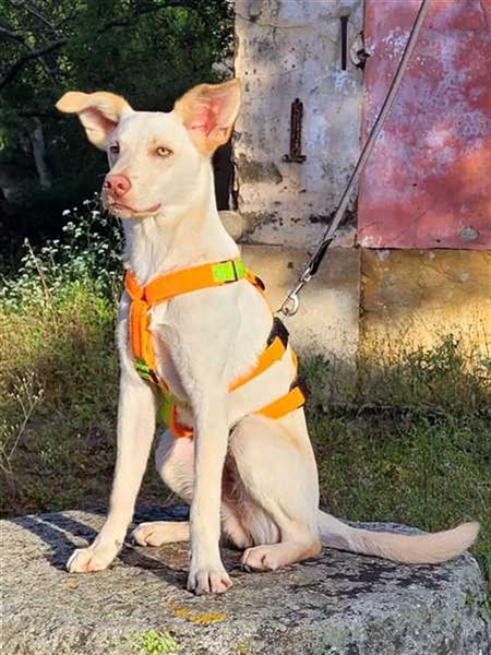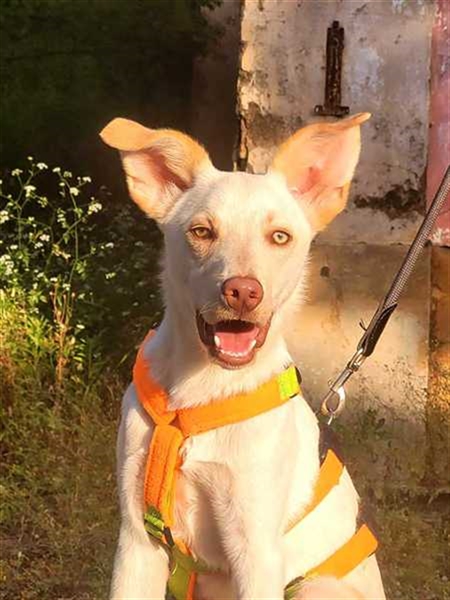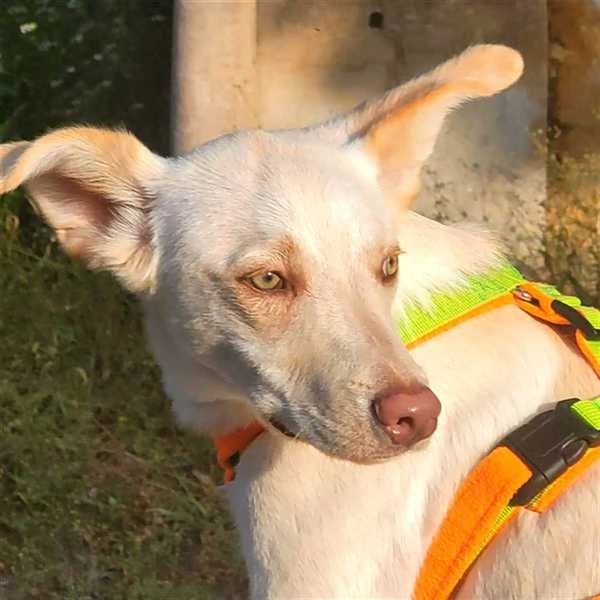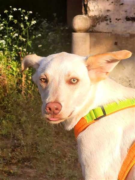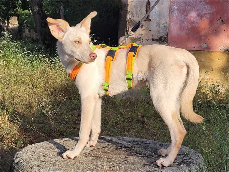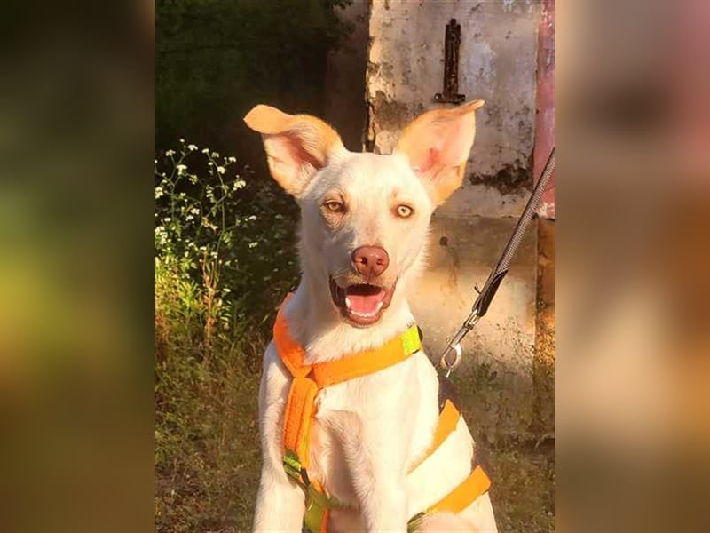 Dieser grünäugige Alien mit dem ganz irdischen Namen ,Alberto', -Berti für seine Freunde- braucht dringend ganz besondere Menschen, die sich seiner annehmen. Er wurde im Dezember mit einem Brüderchen im Dickicht gefunden und beide zeigten sich bereits sehr verwildert und ängstlich. Das Geburtsdatum wurde damals auf den 1. 9. 2022 geschätzt. Dann erkrankte Alberto am sehr seltenen Adenovirus. Neben einer Leberentzündung verursacht dieser Virus eine Hornhauttrübung, die rechts immer noch leicht vorhanden ist und behandelt wird. Den Virus hat er überstanden und ist nun immun. Grössere Sorgen macht uns allerdings, dass Alberto durch die langwierige Erkrankung in Quarantäne bleiben musste , lange Zeit nicht geimpft werden durfte und dadurch in der wichtigsten Jugendphase keine Ängste abbauen konnte. Er ist dennoch kompetent im Umgang mit Hunden, auf Menschen geht er aber von selbst nicht zu, was auch mit den vielen Behandlungen zu tun hat, die er über sich ergehen lassen musste. In der Gruppe geht Alberto gerne spazieren und wird immer sicherer, aber Zivilisationsgemeinheiten erschrecken ihn noch. Alberto wiegt jetzt (Juni 2023) 12 kg bei 45cm Schulterhöhe und wird mittelgross bleiben. Wer gibt Bertis Leben eine Wende?