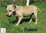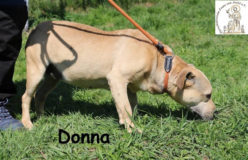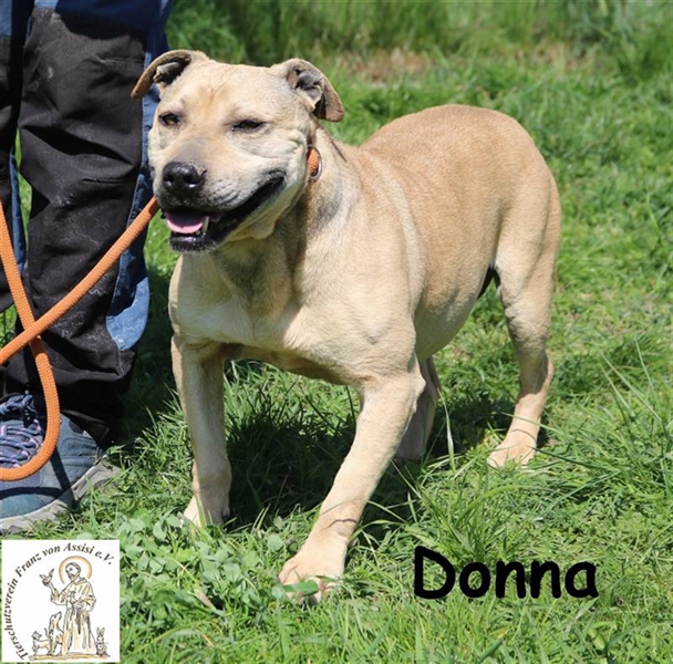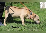 Donna ist eine ausgesprochen liebe Hündin, die Menschen mag, nicht zuletzt auch Kinder. Eine Eigenschaft, die Donna keiner zutraut, weil die ihr vererbten Listenhundgene sofort ins Auge fallen. Donna wurde aber nicht nur genetisch vom Schicksal benachteiligt. Unverantwortliche, rohe Menschen missbrauchten sie für Hundekämpfe. Insofern grenzt Donnas Sanftmut Menschen gegenüber an ein Wunder.