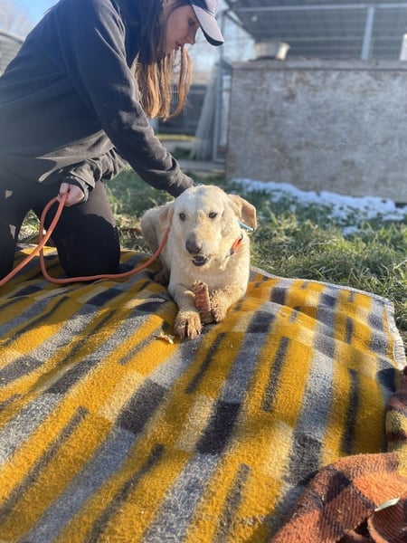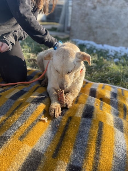 Und auch Haribo wurde zuletzt an einer kurzen Kette gehalten, gerade so lange, dass er unter ein Blechdach kriechen konnte. Wir wollen gar nicht daran denken, wie wenig Schutz Haribo bei Hitze, aber auch bei Kälte, hatte. Edith folgte einem anonymen Hinweis und war - wie so häufig - entsetzt: Sein Ernährungszustand schlecht - überhaupt der ganze Kerl - war vernachlässigt. Erst unter Druck konnte sie die Herausgabe bewirken.