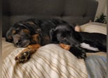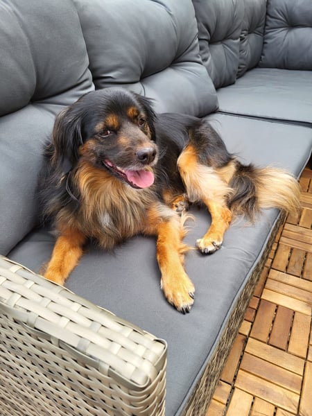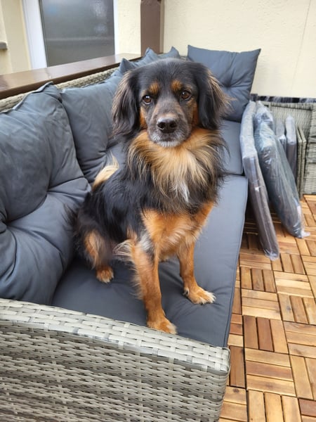 Bruno liebt es auf der Terasse / Veranda zu liegen und den Garten im Blick zu behalten. Wir wünschen uns daher für Bruno ein Zuhause mit Garten.