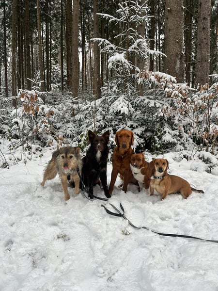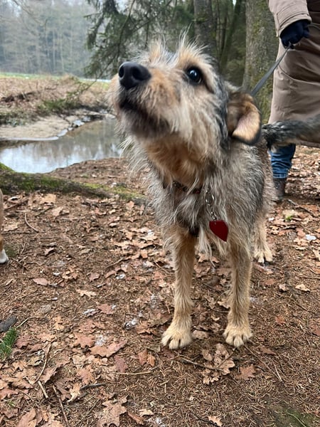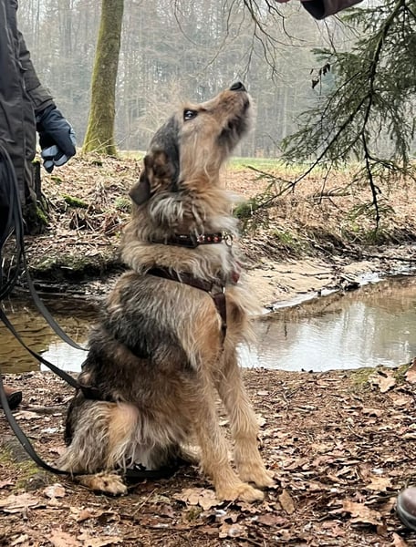 Er genießt das Wandern in der Natur und würde am liebsten mit anderen Hunden spielen. Allerdings ist er bei ersten Hundebegegnungen an der Leine noch unsicher und grummelt schon mal. Geht man dann gemeinsam mit dem anderen Hund und dessen Herrchen/Frauchen ein Stück des Weges, dann spielt er mit ihnen an der Schleppleine.
