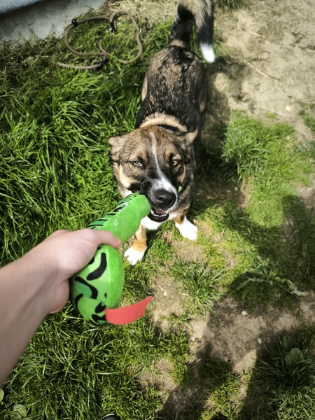 Mit Artgenossen ist Dietrich grundsätzlich verträglich, allerdings kann es in Sachen Futter, Spielzeug oder Leckerlis zu Ressourcenthemen kommen – hier ist Aufmerksamkeit und Management gefragt.