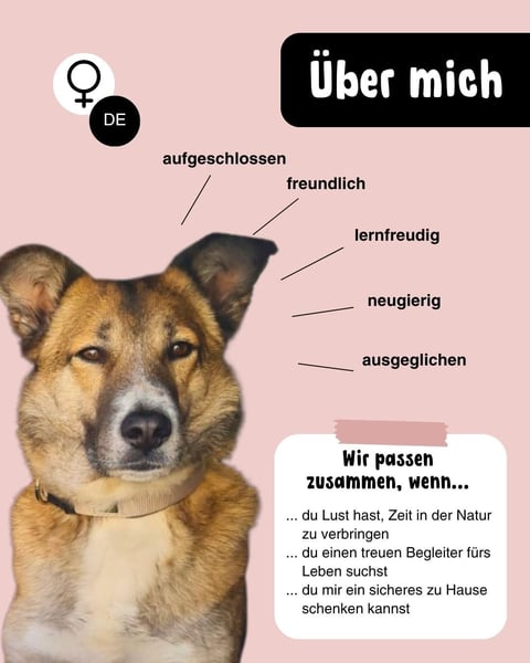 Ich bin eine liebe und neugierige Hündin, die ihre Umgebung gerne erkundet. Menschen gegenüber bin ich anfangs etwas schüchtern, aber immer freundlich. Ich brauche ein bisschen Zeit, um Vertrauen zu fassen, doch wenn ich jemanden ins Herz geschlossen habe, bin ich sehr anhänglich, kuschelig und treu. Mit anderen Hunden komme ich nicht immer auf Anhieb klar. Die Sympathie entscheidet – große Rüden oder Dackel finde ich oft klasse, bei Hündinnen kann es aber schon mal schwierig werden. Ich wäre also entweder gerne Einzelprinzessin, die ihre Menschen für sich hat, oder Zweithund, wenn die Chemie stimmt.