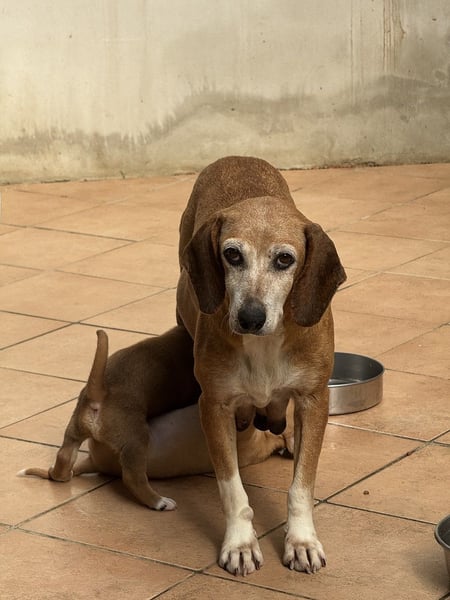 Dort hat sich das Quintett zwischenzeitlich gut erholt. Silke sei eine hervorragende Mutter, die sich liebevoll um ihre Babies kümmere, hören wir aus dem Refugio. Anfangs sei die Hundemama etwas schüchtern gewesen, aber mittlerweile habe sie wohl verstanden, dass ihr nichts Böses mehr geschehen könne. Unsere Freundin meldet weiter, dass Silke zu ihr Vertrauen gefasst habe, bei Fremden allerdings wieder Zeit brauche, um diesen Effort erneut zu leisten. Die tapfere Hündin habe in der Zwischenzeit auch gelernt, einigermaßen an der Leine zu gehen, wenn auch mit wenig Begeisterung. Silke hat eine kurze Rute, die laut der Tierschützerin so auch angeboren sein könnte (für InteressentInnen aus Österreich oder der Schweiz müsste dies vor Ausreise verifiziert werden).