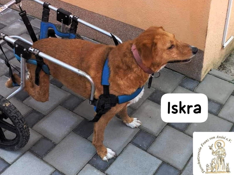 Iskra ist verträglich mit anderen Hunden und auch mit der Katze in der Pension. Sie ist menschenbezogen, lässt sich problemlos anfassen und auch sauber machen und sie verbreitet mit ihrer freundlichen Art eine ansteckende Lebensfreude. Natürlich bringt es Verantwortung mit sich, einem halbseitig gelähmten Hund ein Zuhause zu geben. Wer Iskra aufnimmt, muss sich bewusst sein, dass sie besondere Pflege benötigt: Ihr Rollstuhl braucht regelmäßige Aufmerksamkeit, beim Erledigen ihres Geschäfts ist manchmal Hilfe nötig und ein Zuhause mit möglichst wenig Hindernissen, idealerweise mit Zugang zu einem Garten, wäre für sie perfekt. Doch all das ist nichts im Vergleich zu dem Glück, das sie schenkt.