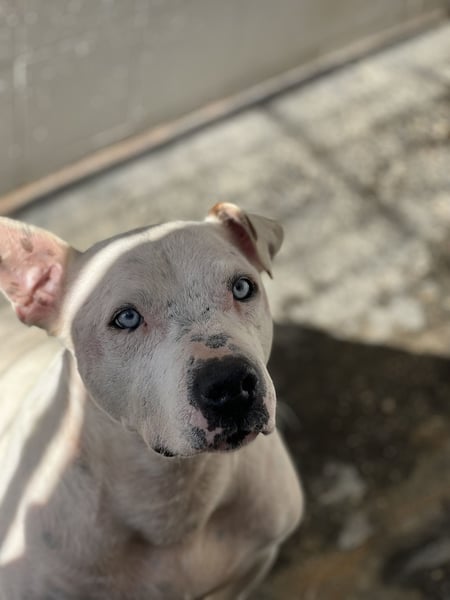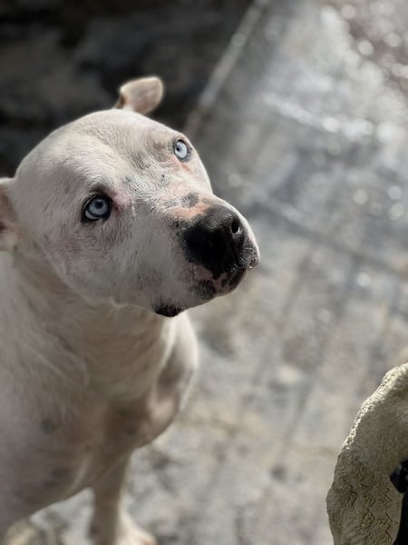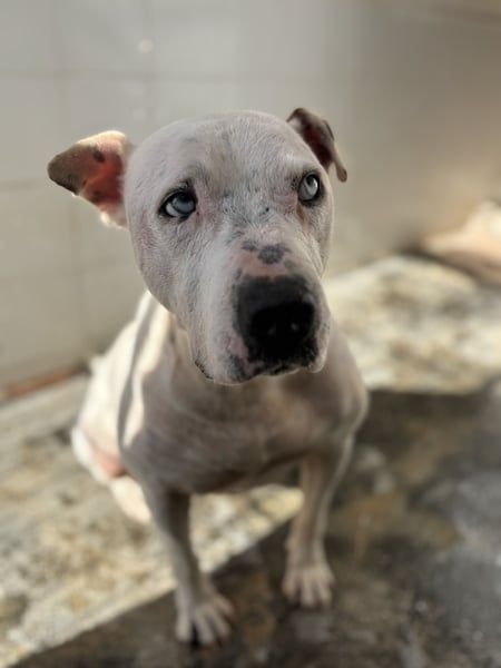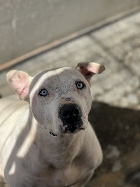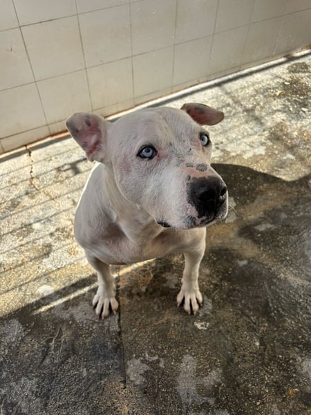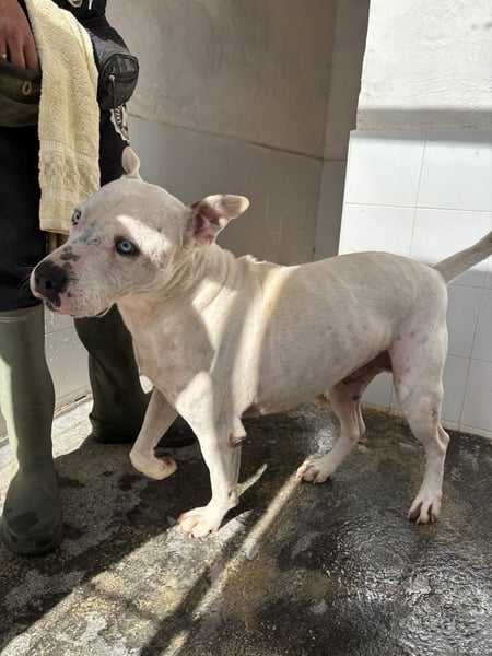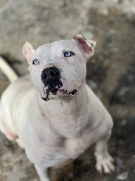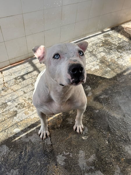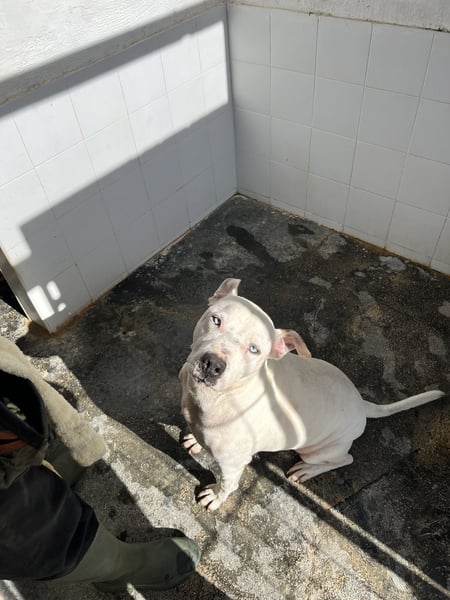 In seinen Unterlagen ist die Rasse Dogo Argentino vermerkt. Aufgrund seines Erscheinungsbildes können wir das nicht sicher bestätigen – deshalb können wir ihn ausschließlich in die Schweiz vermitteln.