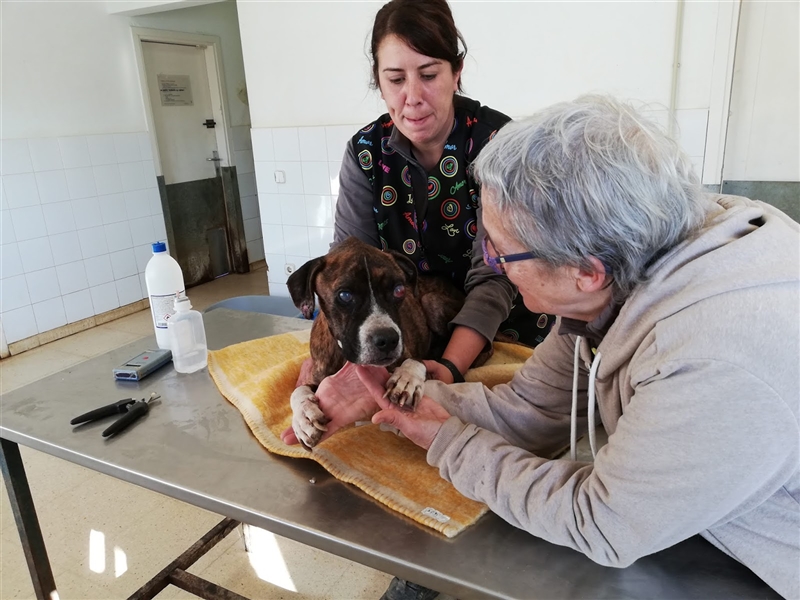 Am nächsten Tag kam Santo, oder Ojitos (« Äuglein » auf Spanisch) wie er bei uns im Tierheim auch liebevoll genannt wird, zu uns ins Tierheim. Sein Zustand war kritisch. Uns war klar dass er neben grossem Hunger und Durst, auch Leishmaniose hat, sowie mit Sicherheit noch einige andere Probleme. Santo war das pure Elend. Er war sehr müde und konnte nicht laufen … und trotz allem hatte er noch die Kraft und auch die Lust zu Leben, und allein mit den allerersten Hilfsmassnahmen, ging es ihm schnell deutlich besser. Die ersten drei Tage konnte Santo nur aufstehen, wenn wir ihn mit einem speziellen Geschirr für die Hinterbeine getragen haben. So konnten wir ihm helfen, mehrmals täglich seine Geschäfte zu erledigen. Wir haben alle gedacht dass sein Bein gebrochen wäre, aber das war nicht so. Er war einfach extrem schwach. Am vierten Tag konnte er schon kurz von alleine aufstehen, und ab dann ging es täglich und stetig bergauf … und das ist bis heute so. Bei seiner Ankunft hat Santo 12 Kilo gewogen … jetzt wiegt er 18,8 Kilo und es geht ihm herrvorragend! Die ganzen Behandlungen und unsere Pflege haben von der ersten Minuten an prima gewirkt, und wir sind immernoch hoffnungsvoll, dass er mit seinem rechten Auge noch relativ gut sehen wird.