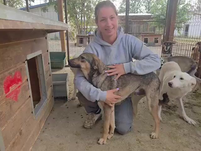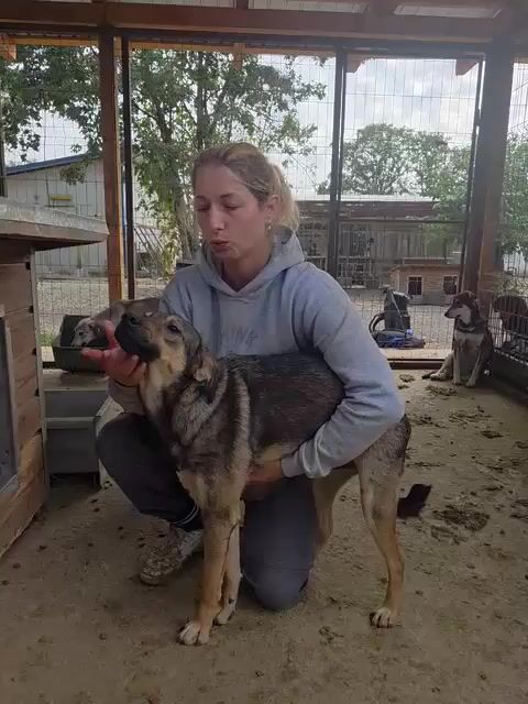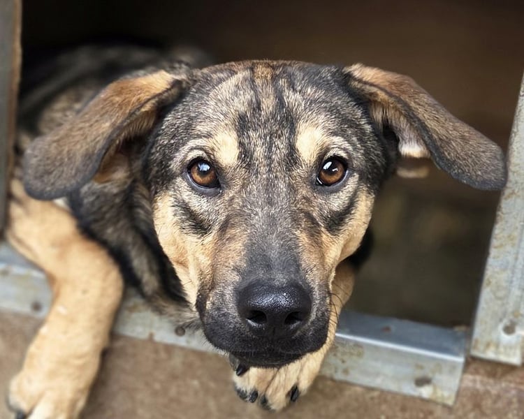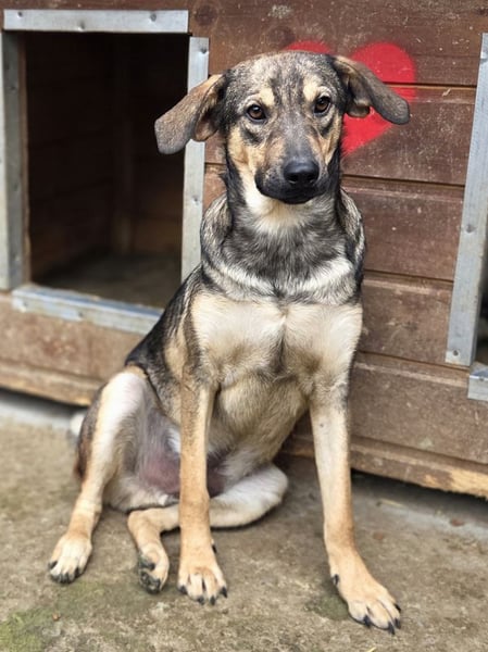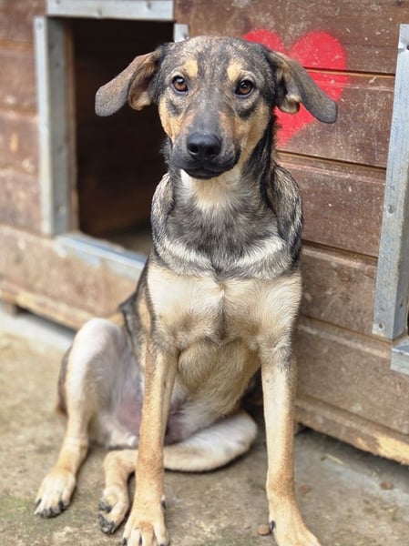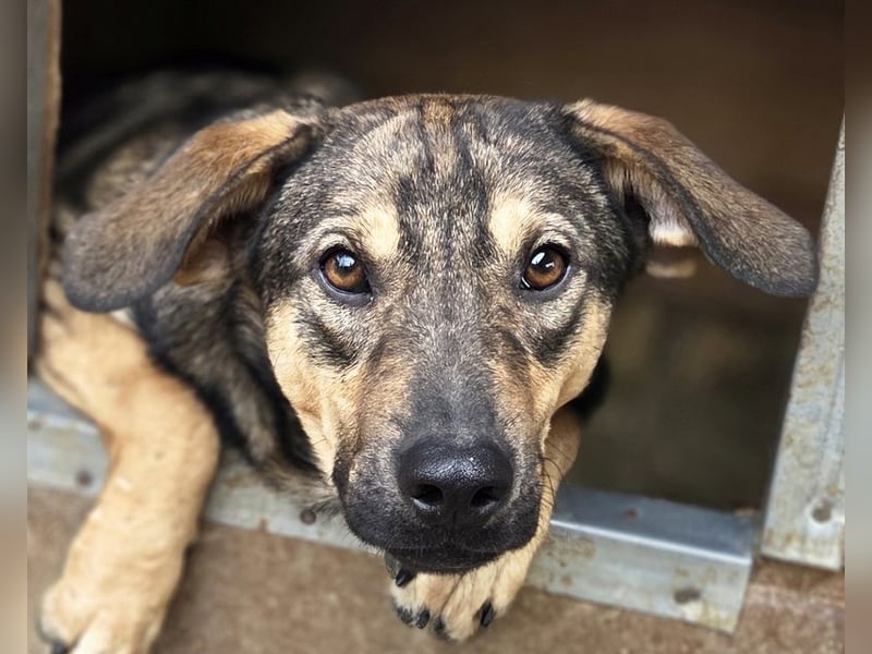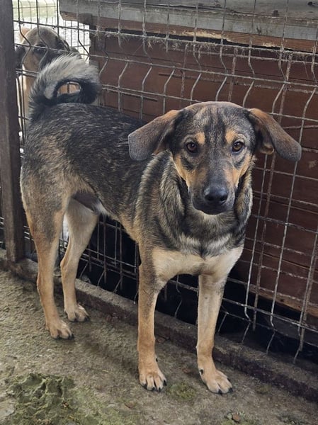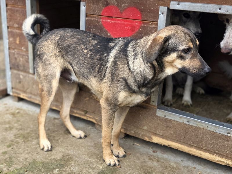 Rio wurde etwa Anfang 2025 geboren – ein junger, braun gestromter Rüde mit einer markanten Ringelrute und etwas „Übergewicht“, das ihn nur noch liebenswerter macht. Wahrscheinlich ist seine einzige Beschäftigung das Futtern und er hat das Glück im Unglück unter Hunden zu sein, wo keinerlei Futterneid herrscht.