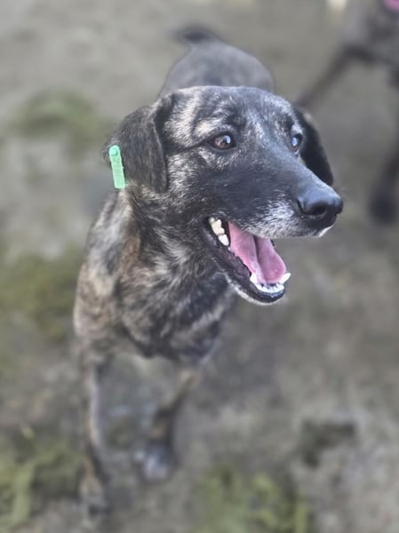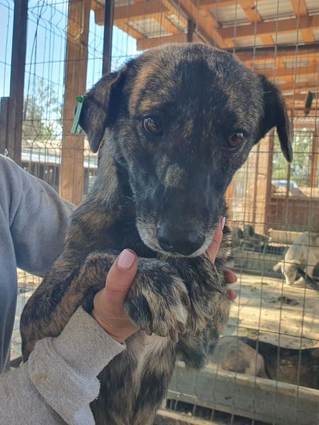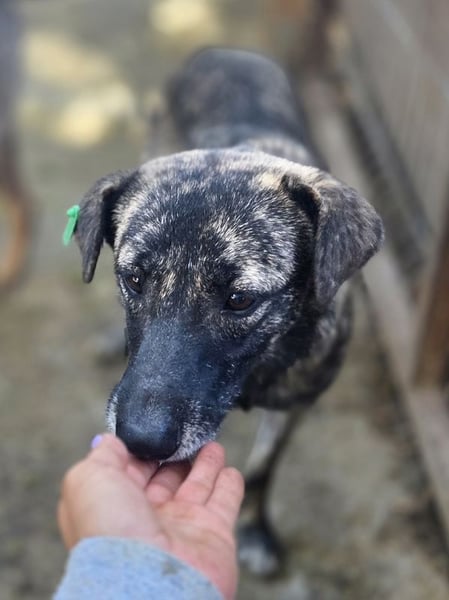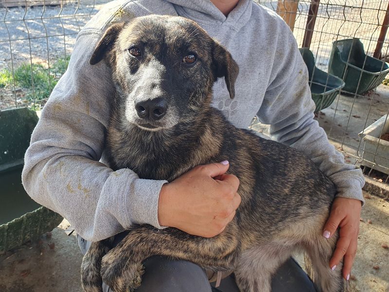 Die hübsche Mable ist eine etwa einjährige Hündin, die wie viele andere schon als Welpe ins Tierheim Bucov/Rumänien kam. Ihr Fell ist wunderschön braun gestromt, die kleinen weißen Fußspitzen wirken fast wie Söckchen. Anfangs mussten wir sie vorsichtig einfangen, doch sie ließ sich dann problemlos überall anfassen. Schon bei unserem ersten Besuch holte sie sich neugierig Leckerchen ab und beobachtete uns genau. Mable ließ sich überall streicheln und sogar auf den Arm nehmen. Sie lebt mit vielen anderen Junghunden in einem kleinen Zwinger und ist dort sehr verträglich und sozial. Nichtmal Futterneid konnten wir beobachten. Trotzdem merkt man ihr an, dass sie ein unsicheres Hundemädchen ist – kein Wunder bei ihrem bisherigen Leben. Mable sollte bald ausreisen dürfen, um endlich zu lernen, dass Menschen liebevoll und zuverlässig sind. In einem ruhigen Zuhause mit Geduld und Zuneigung wird sie sicher schnell Vertrauen fassen und aufblühen.