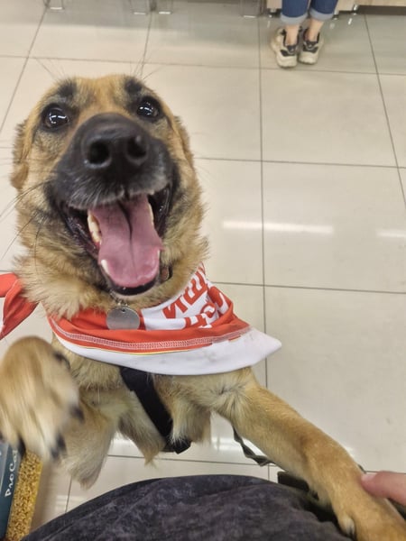 Anfangs reagiert sie etwas nervös auf laute Straßen oder ungewohnte Situationen, beruhigt sich aber schnell, wenn sie die Nähe ihrer Bezugsperson spürt.