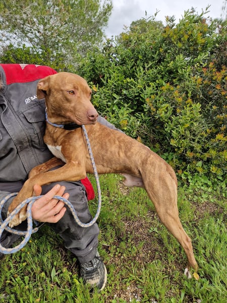 Er und seine 7 Geschwister wurden von der spanischen Polizei aus einem Haushalt geholt, in dem die Junghunde alle zusammen in einem Badezimmer eingesperrt waren.