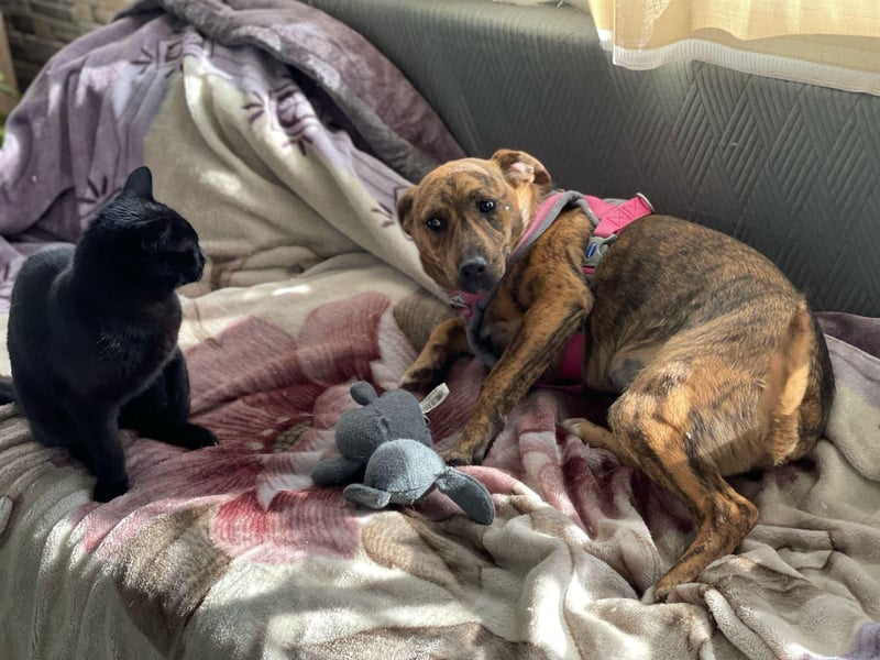 Molly hat kein Problem mit anderen Hunden und geht freundlich mit ihnen um. Sie durfte auch bereits Monika's Katze im Haus kennenlernen und benimmt sich ihr gegenüber sehr freundlich. Sieht sie aber fremde Katzen im Garten, dann möchte sie diese jagen.