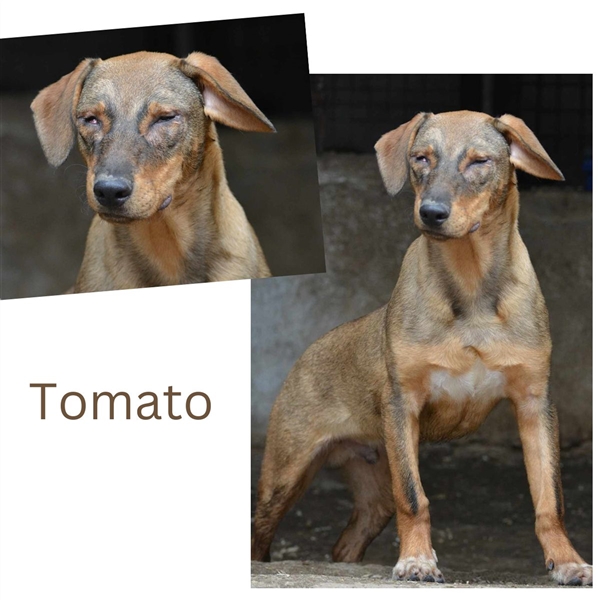Tomato wurde mit einer genetischen Fehlbildung der Augen geboren. Seine Augäpfel waren nicht vollständig entwickelt und befellte Haut wuchs in die Augen. In Bulgarien wurde bereits versucht, dies chirurgisch zu korrigieren, dennoch sind die Augäpfel kleiner als üblich und die Augen wirken eingefallen/verengt.