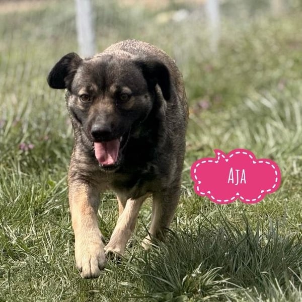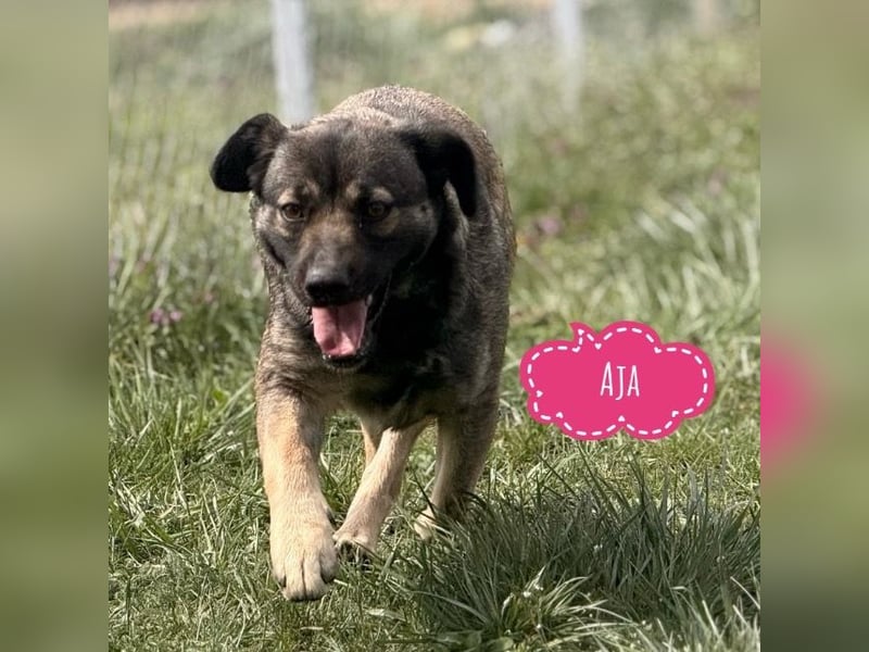 Aja ist ein Mädchen, sie ist laut Tierarztschätzung ca. 2 Jahre alt (geb. 24.03.2024), wiegt 16kg und ist 48cm groß. Sie sieht optisch aus, wie ein Schäferhund-Mischling in kleinen Format. Sie hat eine kurze Rute, es wird vermutet, dass sie so geboren wurde.