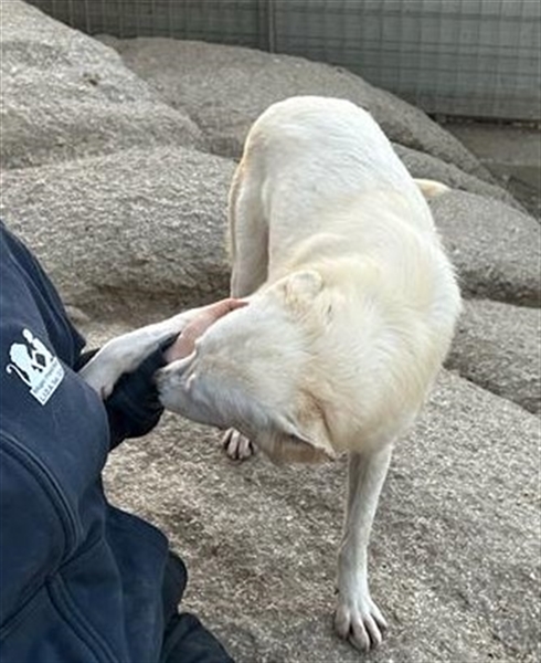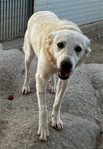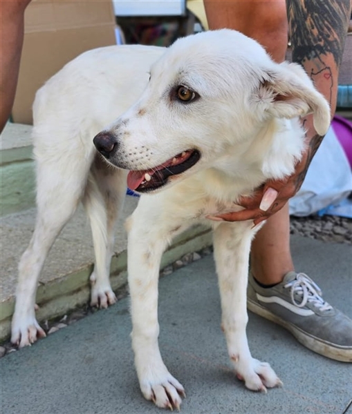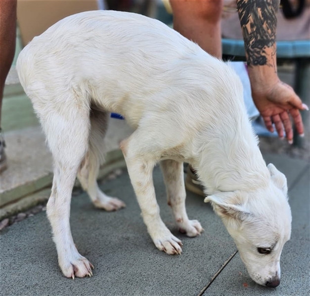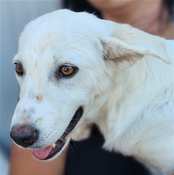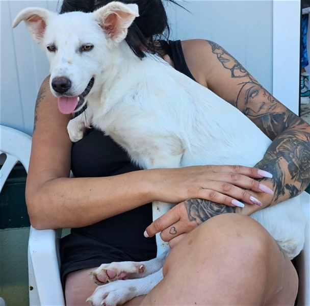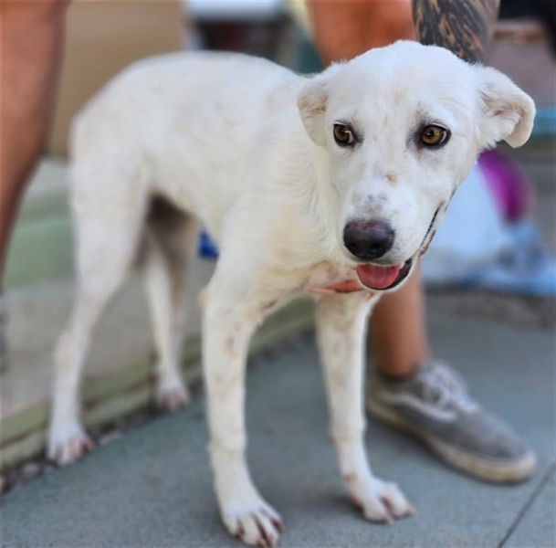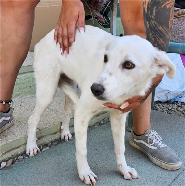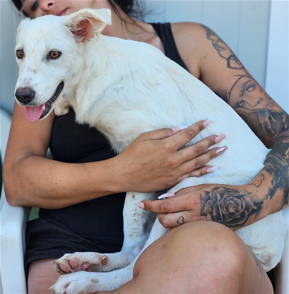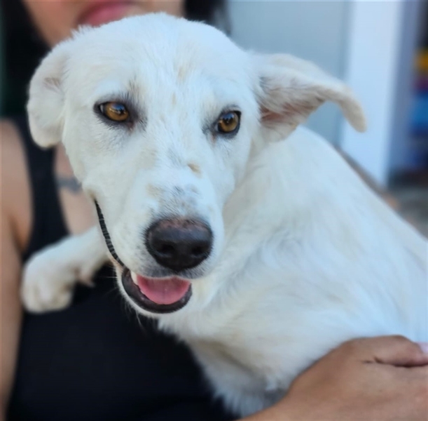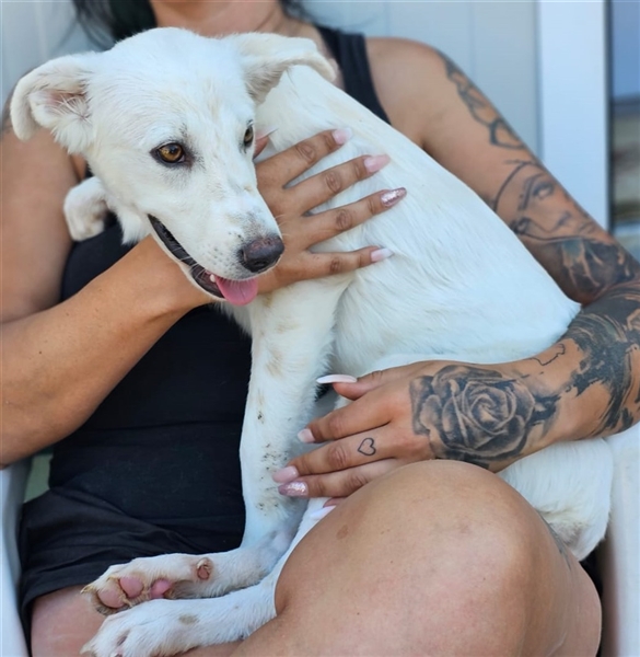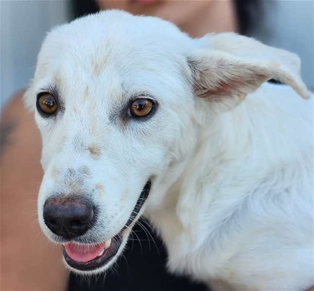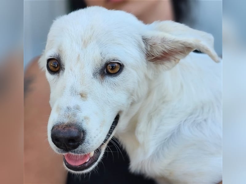 Helga zeigt sich im Tierheim als ruhige und neugierige Junghündin. Sie hat ein sehr angenehmes Wesen, möchte gerne gestreichelt werden und Aufmerksamkeit bekommen, ist dabei aber eher etwas zurückhaltend und überhaupt nicht aufdringlich. Inzwischen ist sie eine hübsche weiße Dame mit niedlichen Sommersprossen.