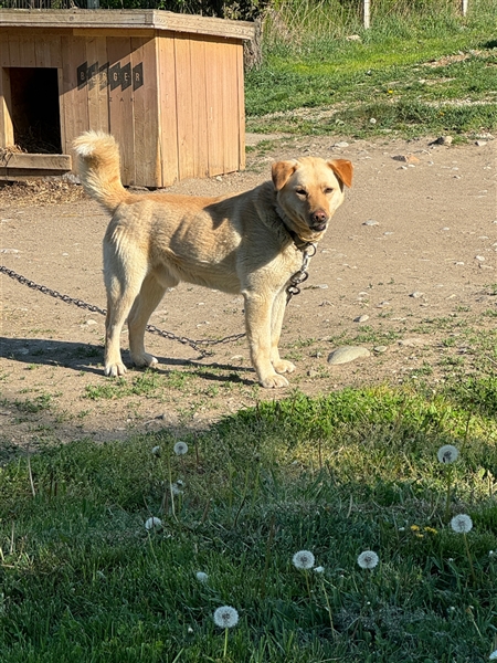 Zsemle lebt an der Kette, weil er mit der größeren Bewegungsfreiheit besser zurecht kommt - aber gleichzeitig möchte er dann nicht, dass Fremde einfach in seinen Radius wandern. Sobald man ihn losmacht oder an die Leine nimmt, ändert sich sein Verhalten. Er möchte immer noch, dass Fremde sich ihm höflich nähern, sehr gerne mit ein paar Leckerlis - und dann ist der imposante Rüde sofort bereit, Dich in seinen Kreis aufzunehmen.