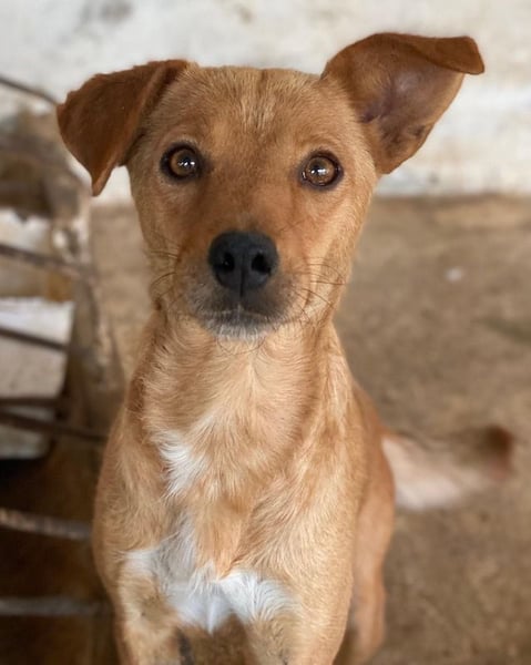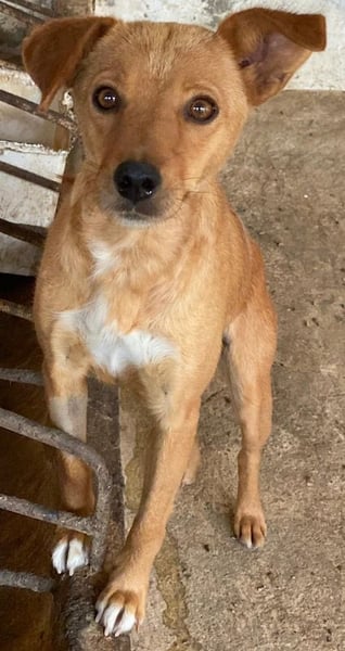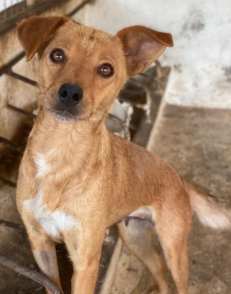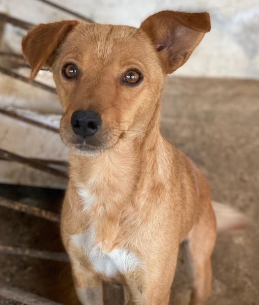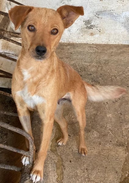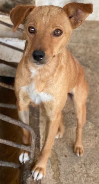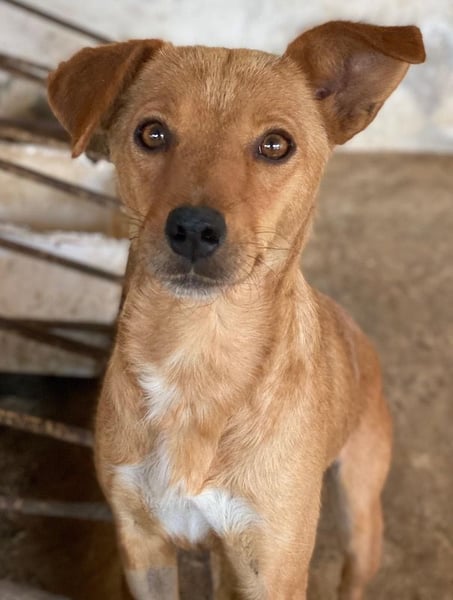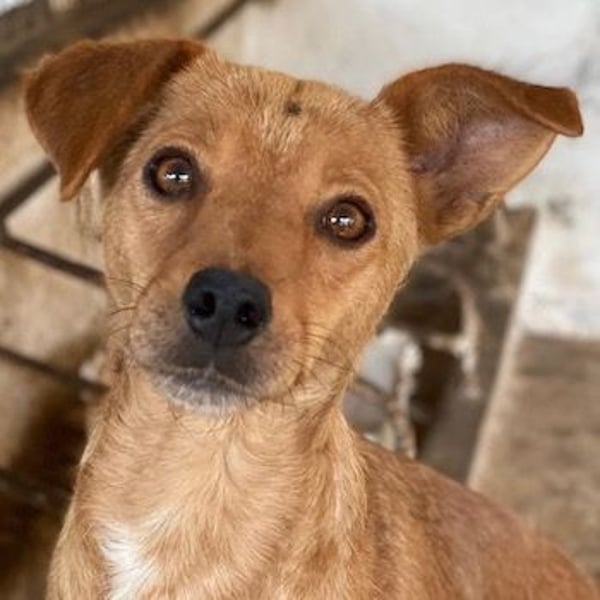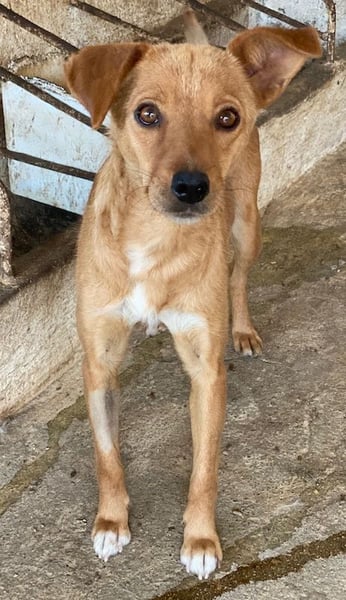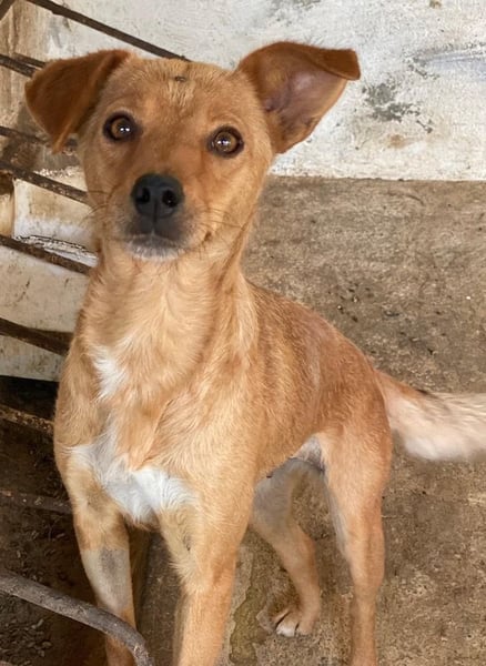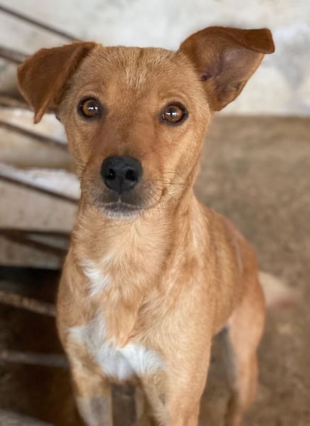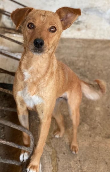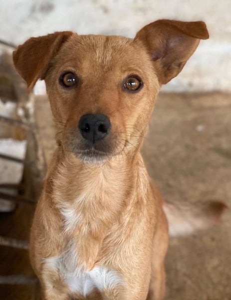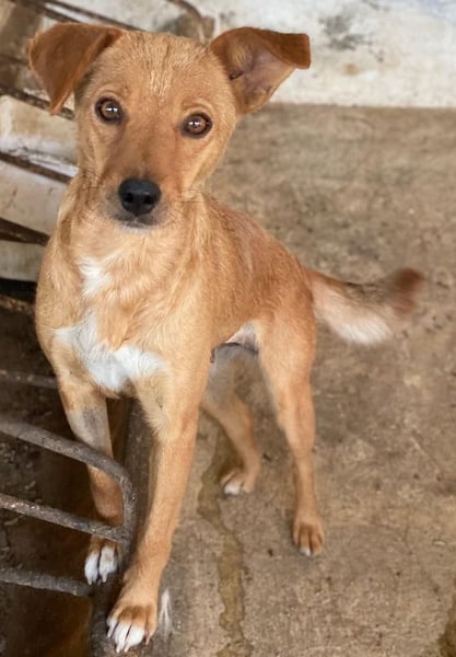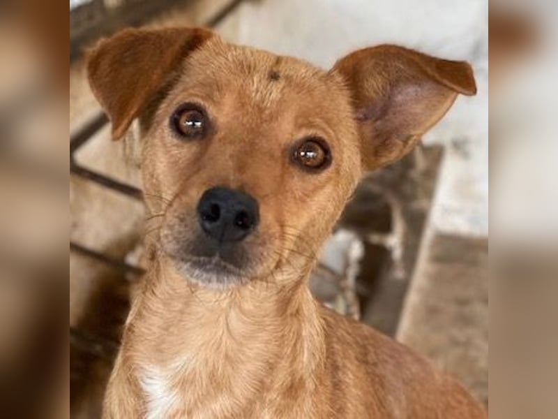Allya ist eine kleine, zierliche Hündin mit beigem Fell und einer hübschen weißen Zeichnung an der Brust. Besonders niedlich sind ihre beiden kurzen Schlappohren – eines davon steht leicht ab und verleiht ihr damit einen ganz besonderen, charmanten Look.