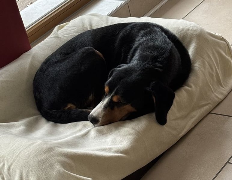 Ebenfalls kennt sie es bereits, eine Zeit lang gemeinsam mit den anderen Hunden allein zuhause zu bleiben. Hier legt sie sich entspannt ab und schläft friedlich in ihrem Körbchen.