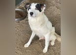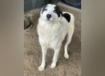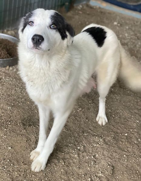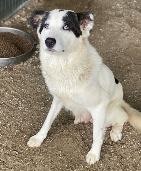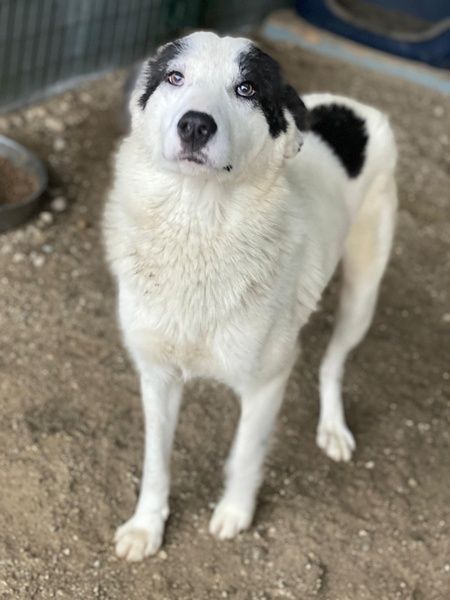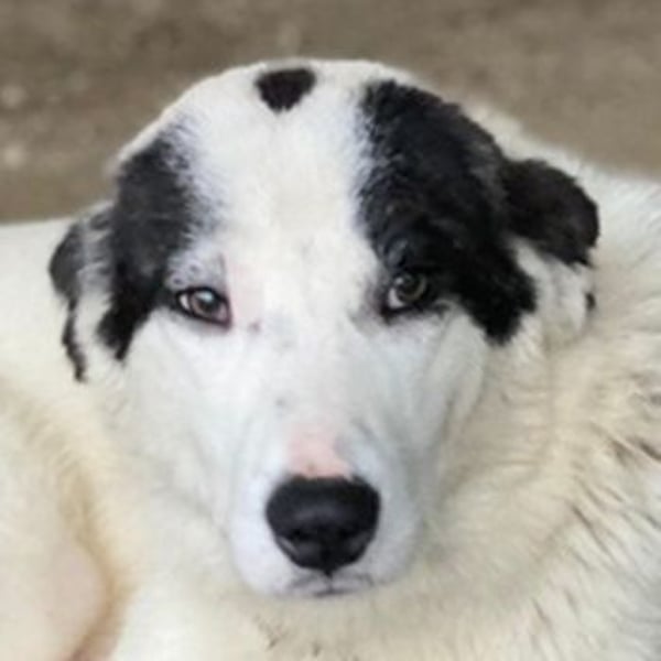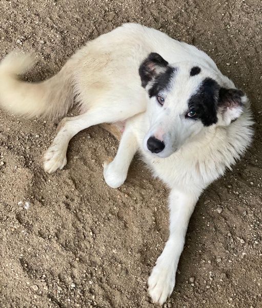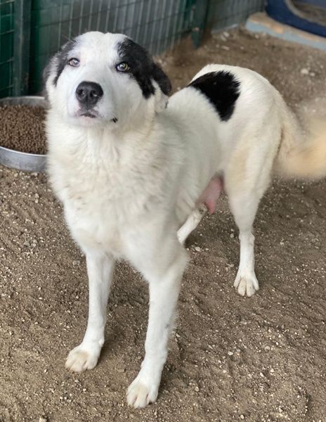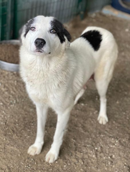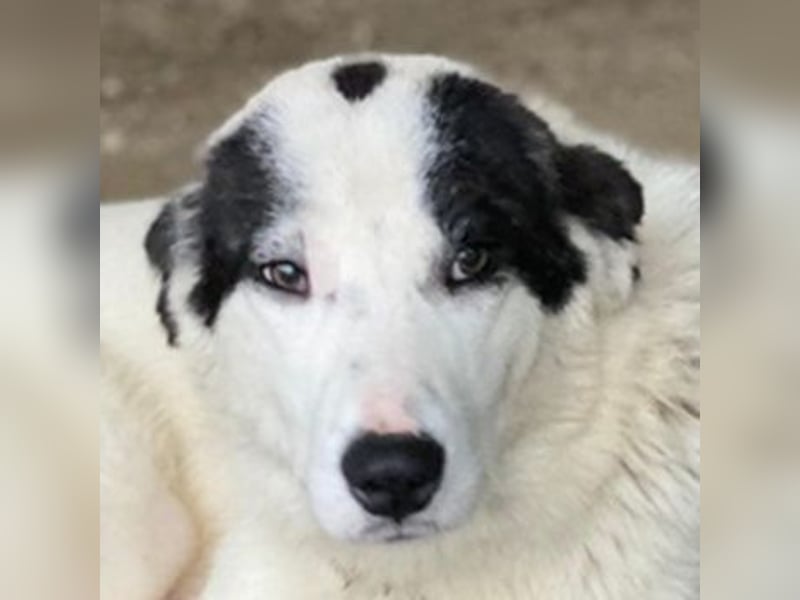 Joletta ist eine wunderschöne Hündin mit schneeweißem Fell und mit ein paar schwarzen Flecken an Kopf und Rücken. Besonders hervorstechend ist ihre witzige, tropfenförmige schwarze Zeichnung am Kopf, womit man sie wohl auch zwischen hunderten Hunden immer ausfindig machen könnte.