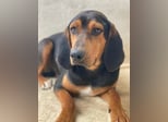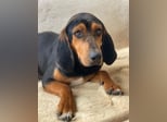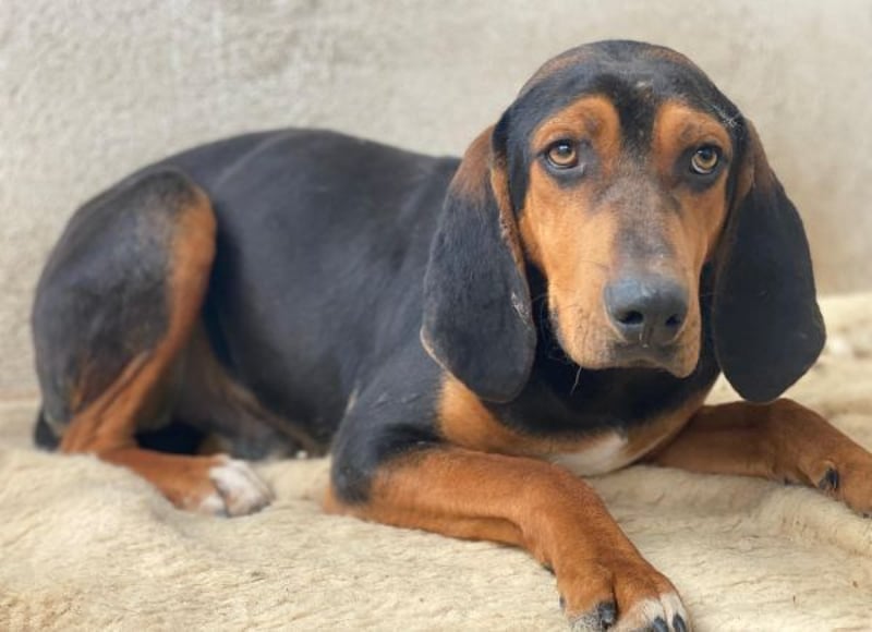 Brios ist ein hübscher Jagdhund-Mischling mit kurzem schwarzem Fell, das von braunen Zeichnungen im Gesicht und an den Beinen ergänzt wird. Sein Blick ist aufmerksam und ruhig; man merkt, dass er seine Umgebung zunächst genau beobachtet, bevor er sich öffnet.