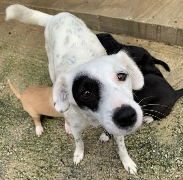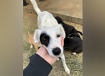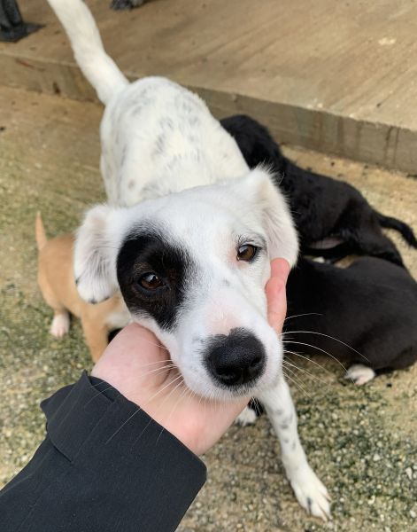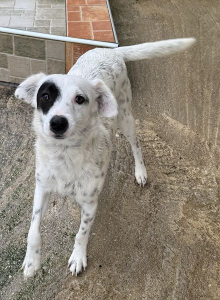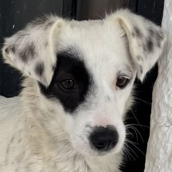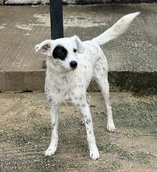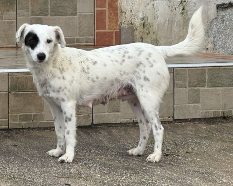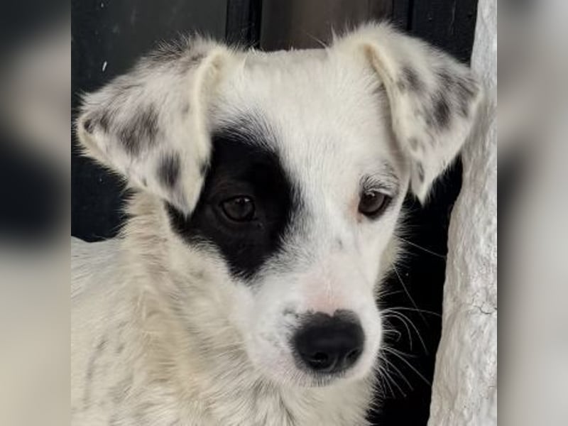 Meybel hat ein wunderschönes, weißes Fell mit zarten schwarzen Pünktchen, die ihr ein ganz besonderes und verspieltes Aussehen verleihen. Besonders auffällig ist ihre einzigartige Gesichtszeichnung: Um eines ihrer Augen trägt sie einen schwarzen Kreis, der wie eine kleine Augenklappe wirkt und ihr einen unverwechselbaren, charmanten Ausdruck schenkt. Dieser besondere Fleck macht sie sofort wiedererkennbar und unterstreicht ihre individuelle Schönheit. Meybel ist eine sehr freundliche und aufgeschlossene Hündin, die Menschen offen begegnet, ohne dabei aufdringlich zu sein. Sie zeigt sich aktuell verträglich mit den anderen Hunden auf der Pflegestelle und freut sich über jede Form von Aufmerksamkeit und Zuneigung. Mit ihrer liebevollen Art zaubert sie ihrer Umgebung schnell ein Lächeln ins Gesicht.