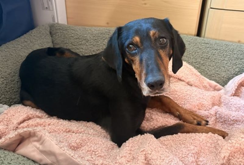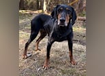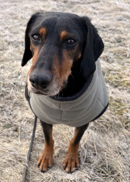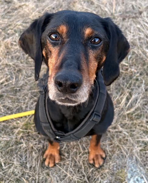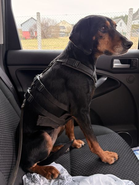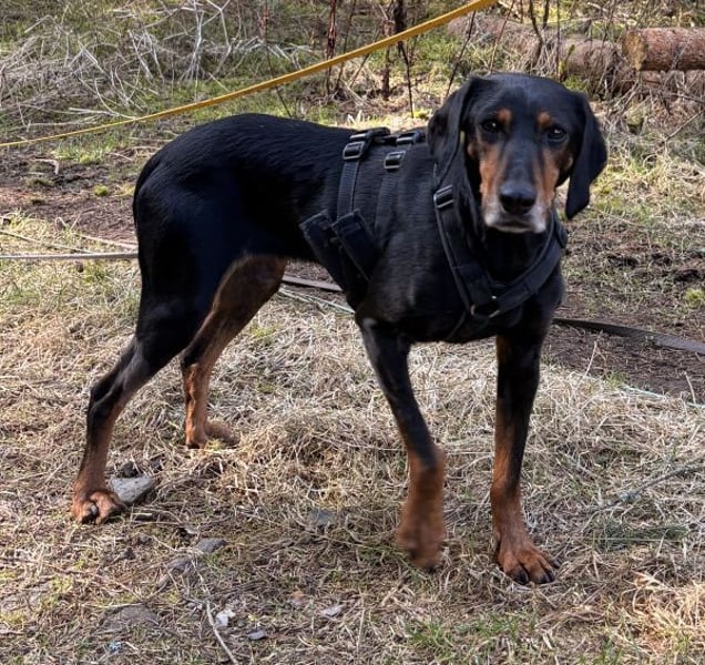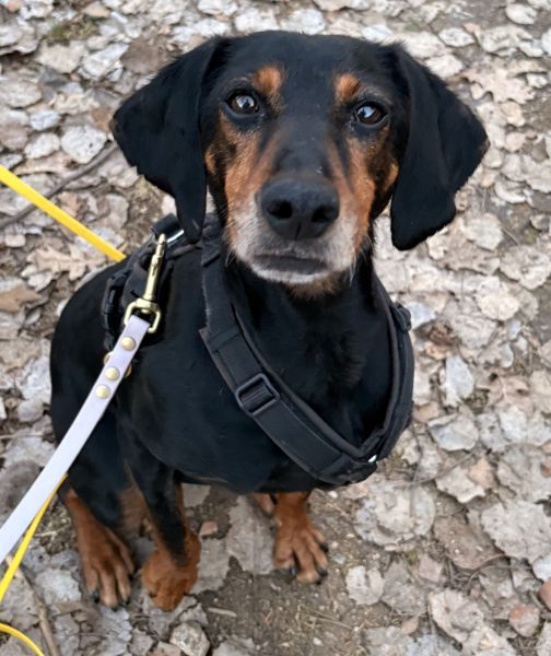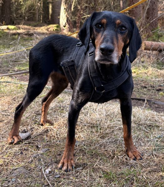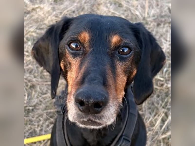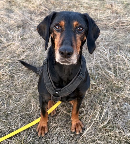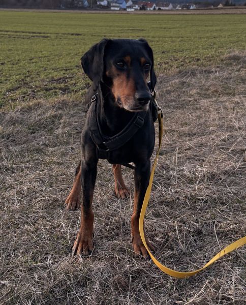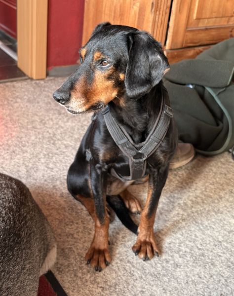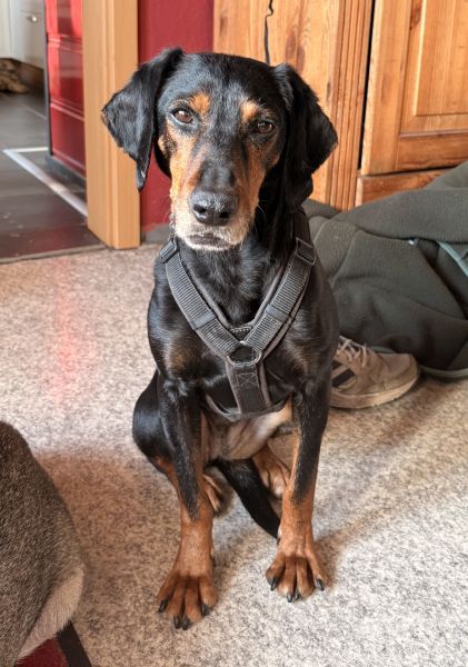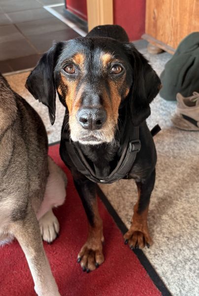 Wer in ihre warmen Augen blickt, erkennt sofort das große Potenzial dieser Hündin. Neria ist eine wunderschöne Hündin. Ihr kurzes, glattes Fell ist klassisch schwarz mit braunen Abzeichen, und ihre sanften Schlappohren verleihen ihr einen dackelähnlichen Charme.