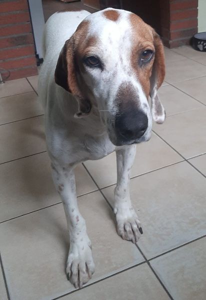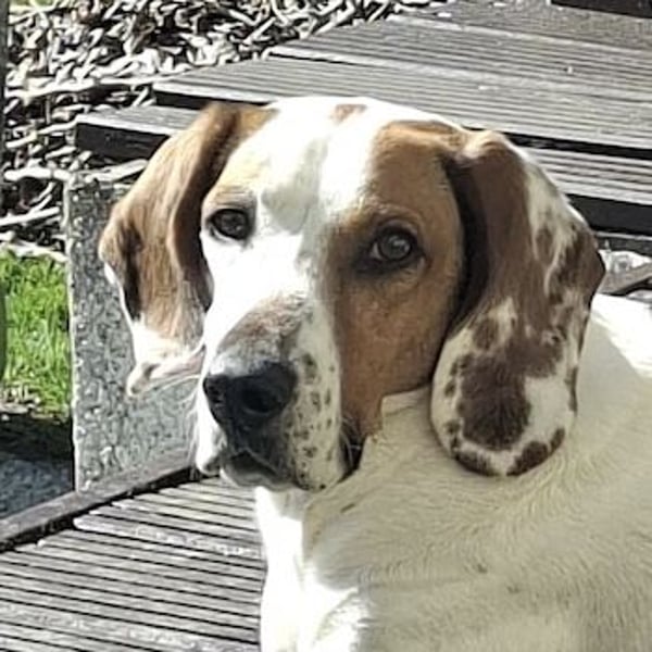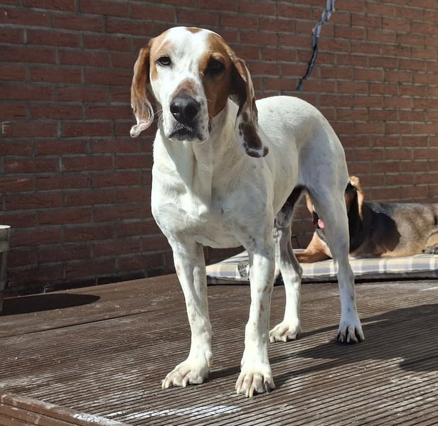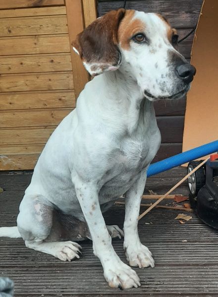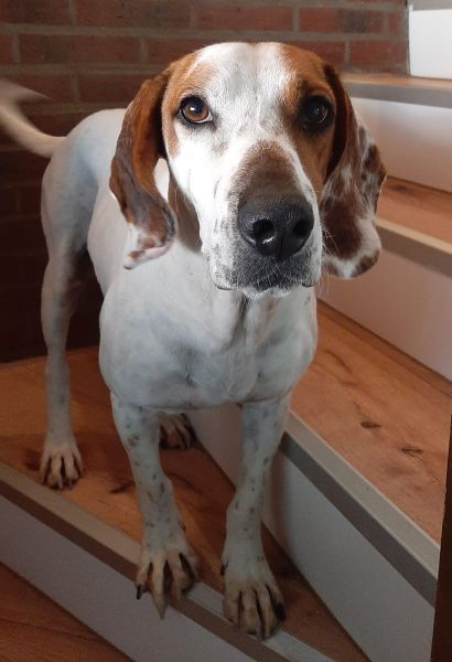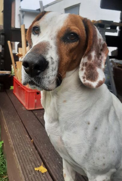 Zack ist ein hübscher Rüde mit kurzem, braun-weißem Fell. Er hat eine angenehme mittlere Größe und große, braune Schlappohren – typisch für einen Jagdhund-Mix.