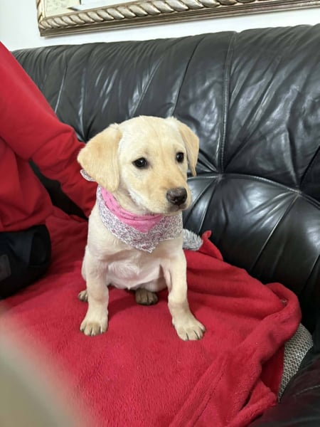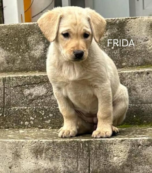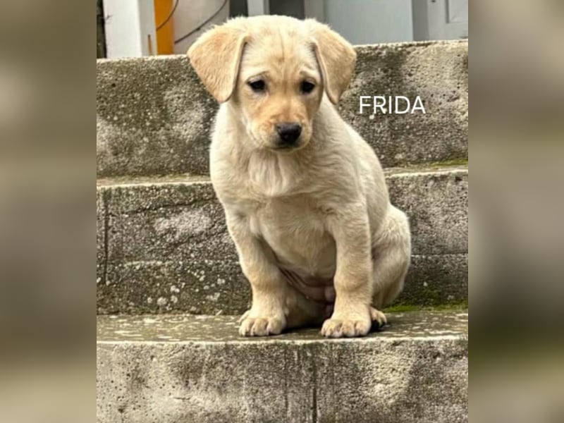 Frida ist ein sanftes, liebevolles Hundemädchen. Sie wurde ohne Rute, mit einem kleinen Stummelschwänzchen, geboren und erinnert optisch an einen Labradormischling. Von den drei Geschwistern ist sie die Sanfteste. Besonders gern liegt sie auf dem Schoß ihrer Pflegemama und genießt ausgiebige Schmuseeinheiten. Trotzdem ist Frida welpentypisch neugierig, verspielt und offen für Neues.