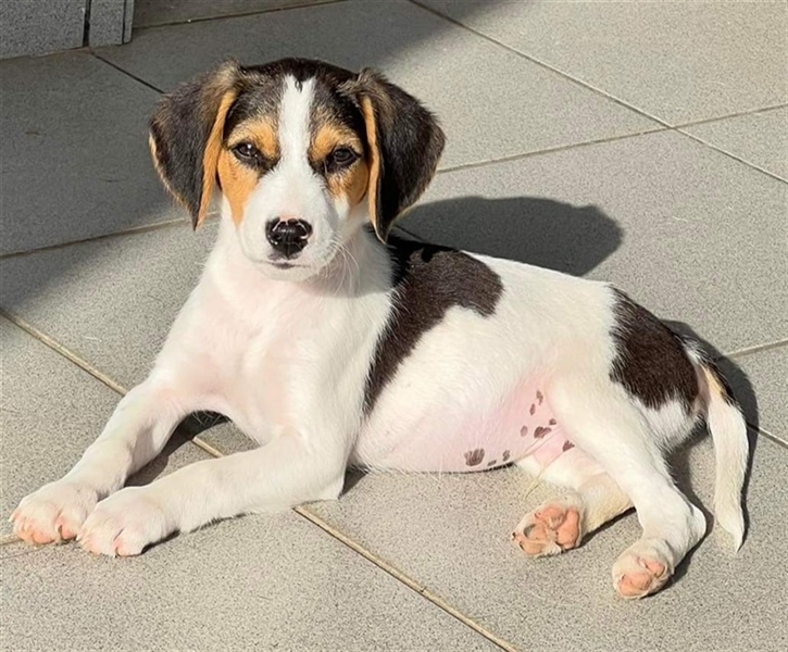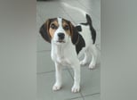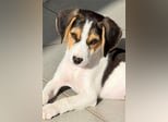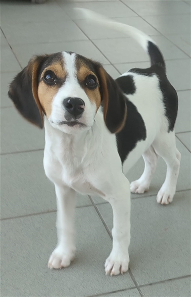 Ich bin knapp 2,5 Monate alt und alle meinen, ich sehe aus wie ein Beaglemix. Was auch immer das ist... Ich werde vermutlich so 20-25kg schwer und liebe Menschen.