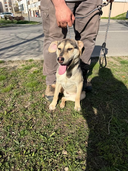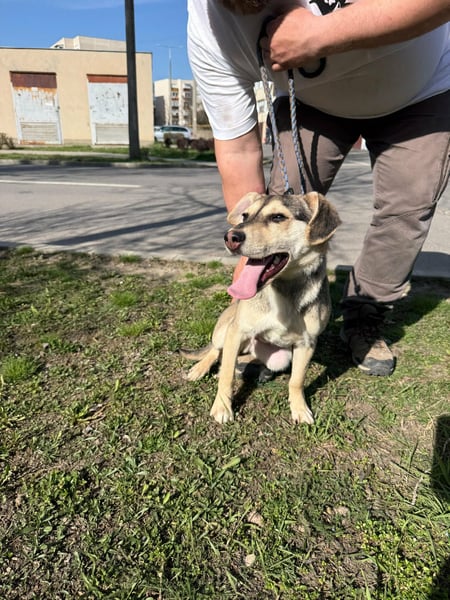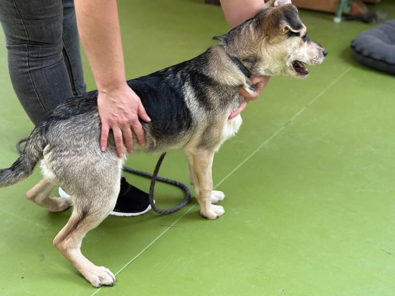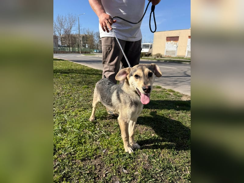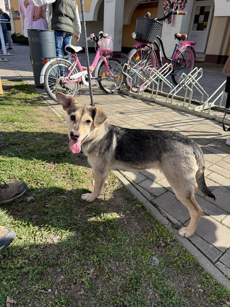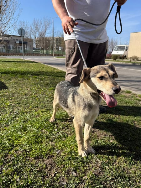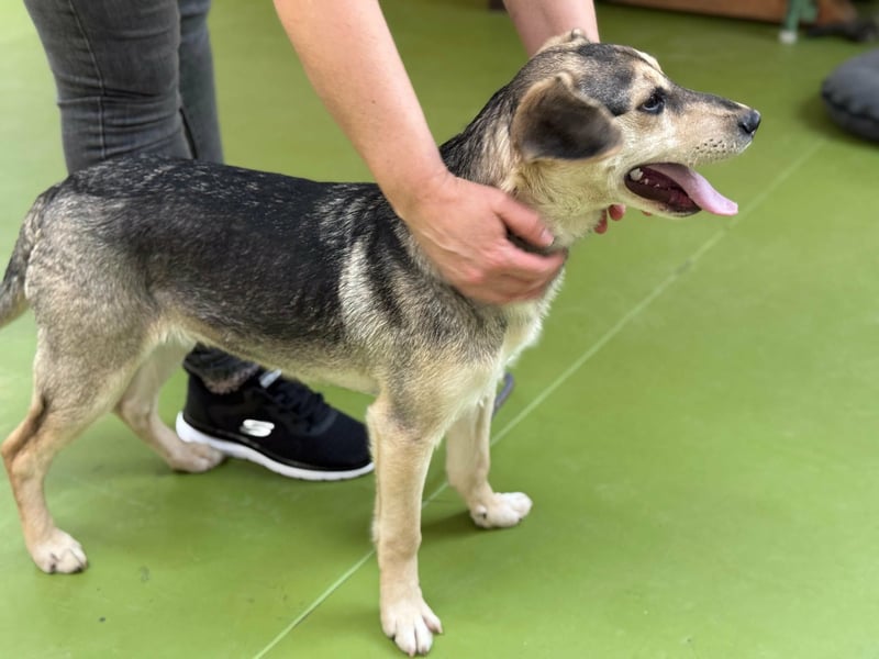 Vitéz, ein junger Mischlingsrüde, geboren Anfang September 2025, misst etwa 44 cm Schulterhöhe und bringt rund 15 kg auf die Waage.