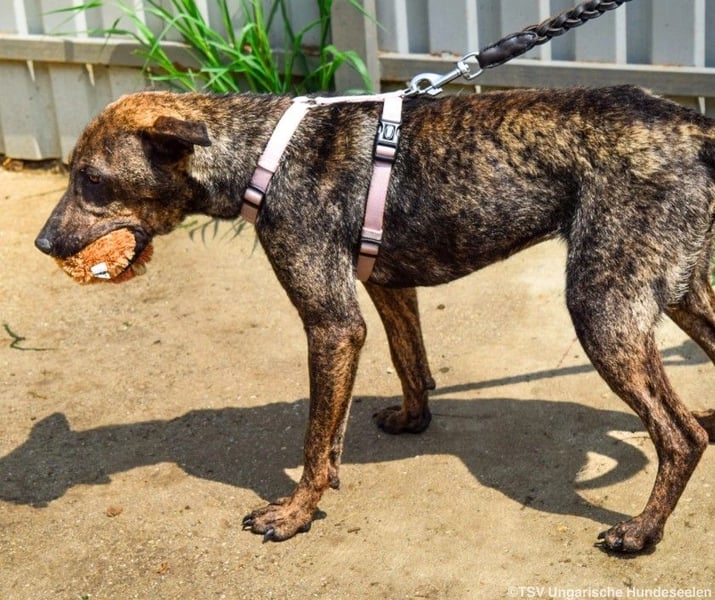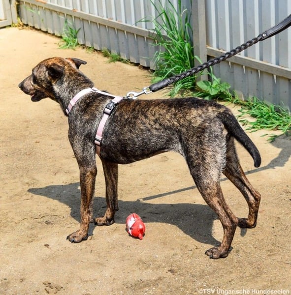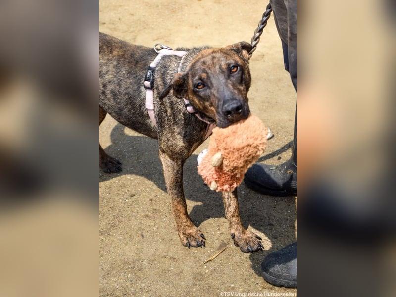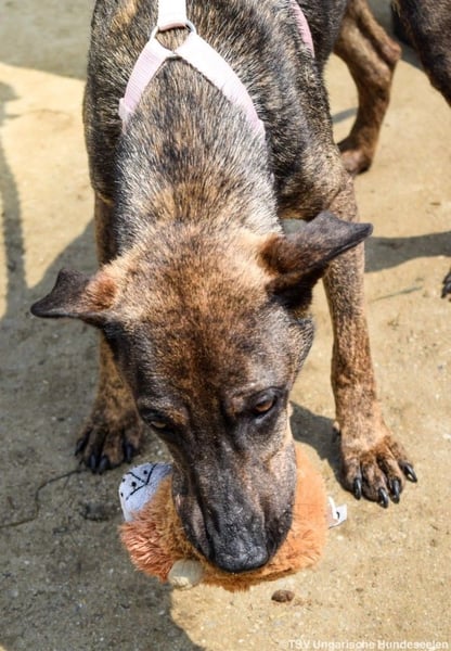 Cindy ist eine offene, interessierte Hündin geworden, die gerne mit ihrem Spielzeug spielt und kuschelt. Sie verhält sich im Grüppchen mit ihren Schwestern verträglich und wäre grundsätzlich an der Seite eines anderen Hundes geeignet. Cindy ist mittel aktiv und wünscht sich in ihrem neuen Zuhause eine gute Mischung aus Auslastung und Ruhe. Das Laufen an der Leine muss mit ihr weiter trainiert werden. Leider haben die Tierheimmitarbeiter vor Ort nicht die Zeit, das zu üben. Kinder wären für sie kein Problem, nur sollten diese aus dem Kleinkindalter heraus sein, damit es keine Missverständnisse gibt. Cindy ist eine freundliche Hündin, die es verdient hat, dem Zwinger endlich den Rücken zuwenden zu dürfen. Wir wünschen uns für die Hündin Menschen, die gerne was unternehmen und dafür eine treue Begleiterin an ihrer Seite suchen. Wer gibt dieser tollen Hündin die Chance auf ein Zuhause, fern ab vom Tierheimleben?