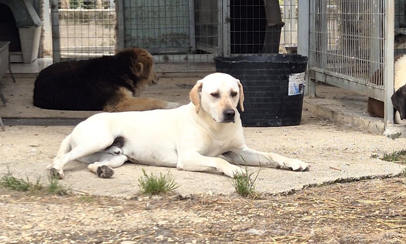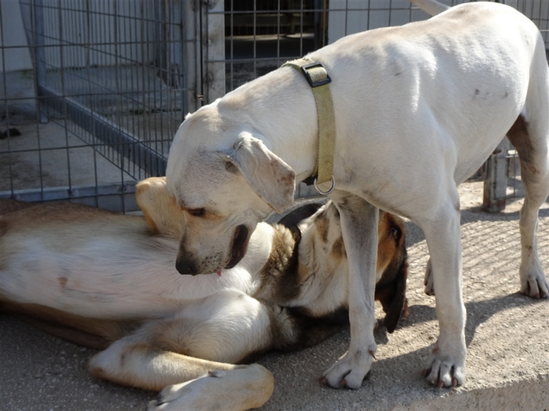 Sintos wurde eigentlich nur für seine Kastration in unser Kooperationstierheim gebracht. Nachdem der Rüde nach der Kastration wieder an seinen gewohnten Platz in der Nähe einer Siedlung zurückgebracht wurde, meldeten die Anwohner, dass Sintos sich in jedem Garten vorstellig machte, sich nicht vertreiben lasse und dies störend sei. Der liebe Kerl hat vermutlich nur nach liebevoller Aufmerksamkeit und Anbindung zu den Menschen gesucht. Um Sintos vor allfälligen Gefahren zu schützen, wurde er wieder in das Tierheim zurückgebracht, wo er seither problemlos in einer wild durchmischten Hundegruppe lebt. Über seine bisherige Lebensgeschichte können wir leider keine Auskunft geben.