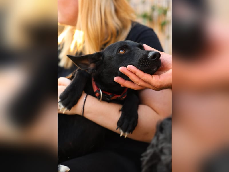 Romul ist ein sanfter, lieber Hund mit einem neugierigen Blick und wachsamen Augen, die immer auf der Suche nach neuen Abenteuern sind. Sein glattes, schwarzes Fell glänzt in der Sonne, und seine aufgestellten Ohren verraten: Hier steckt ein kleiner Entdecker voller Lebensfreude!