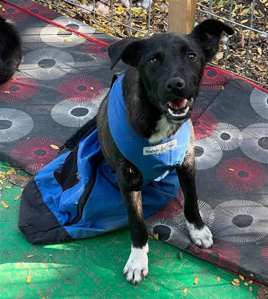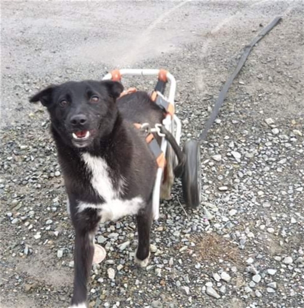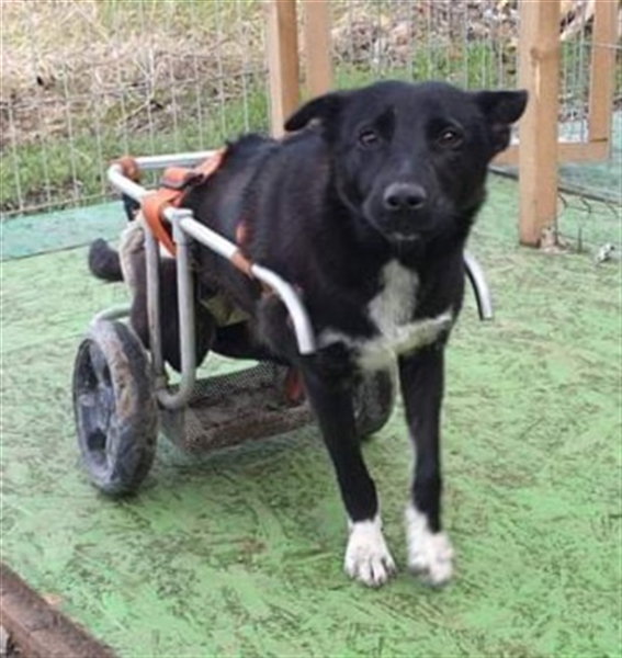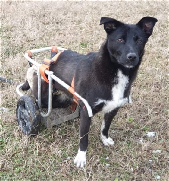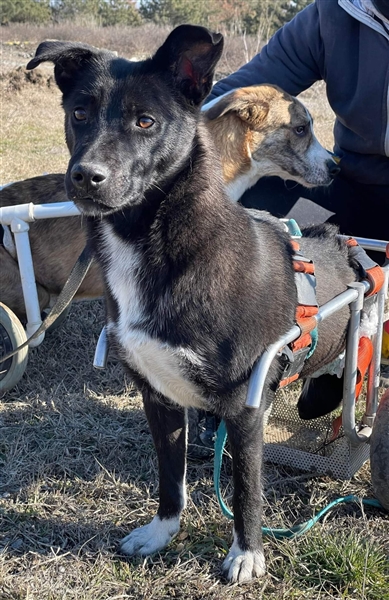 Der Spezialist riet von einer OP ab, da er die Schädigung der Wirbelsäule für irreversibel hält und so wurde Frida mit einem Rutschsack und einem Rollstuhl ausgestattet und das Team bei Dex begann, mit ihr damit zu üben.