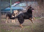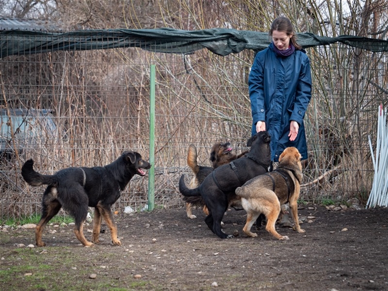 Auf dem eingezäunten Hundespielplatz, den die Welpen regelmäßig besuchen dürfen, genießt er die Freiheit sichtlich und hat Spaß am Spiel mit den anderen Hunden. Das Anlegen von Geschirr und Leine ist für Sultan auch kein Problem. Wir sind sehr zuversichtlich, dass er sich bald komplett entspannt und seinen Pflegern vollkommen