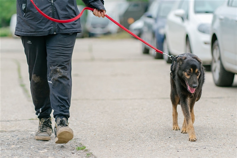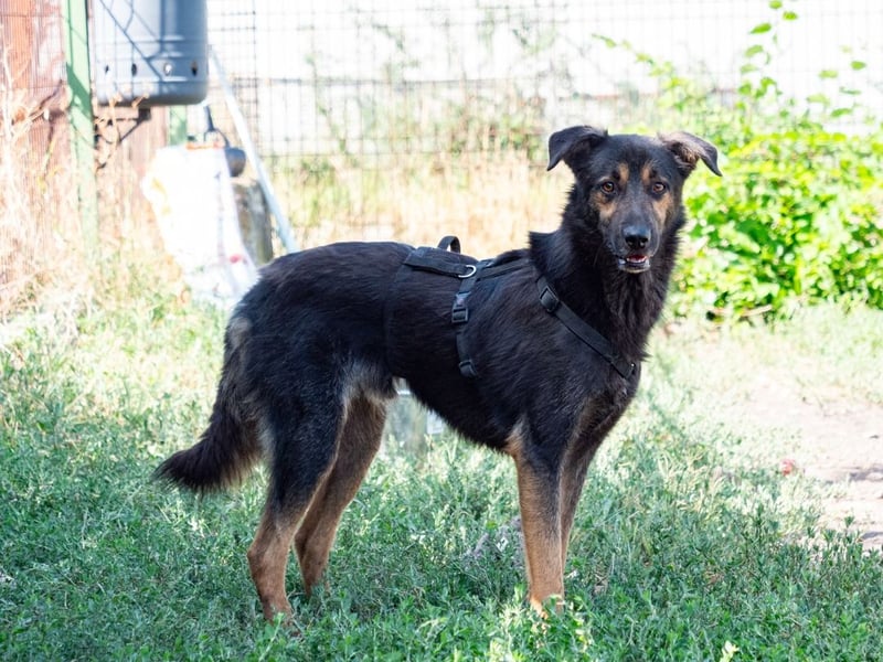 Das Anlegen des Geschirrs ist für Sultan noch ungewohnt, doch er lässt es tapfer und gelassen geschehen. Sobald er es trägt, entspannt er sich deutlich und läuft aufmerksam und verlässlich an der Leine bis zum Hundespielplatz. Dort blüht er auf: Er tobt gerne mit seinem Bruder und erkundet neugierig die Umgebung.