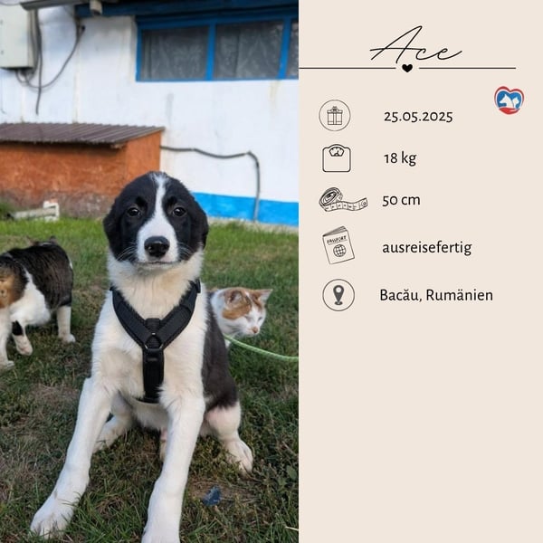 Zu ACE: Der im Mai 2025 geborene Rüde wiegt 18 kg und ist ca. 50 cm groß. ACE hat ein sanftes Wesen, ist aber anfangs sehr vorsichtig. Bei ihm siegt seine Neugierde meist schnell und so taut er auf und er erkundet gern seine Umgebung. Er möchte die Welt kennenlernen und das auch gern auf spielerische Art. Gerne kann er in eine Familie mit etwas größeren bzw. ruhigeren Kindern vermittelt werden.