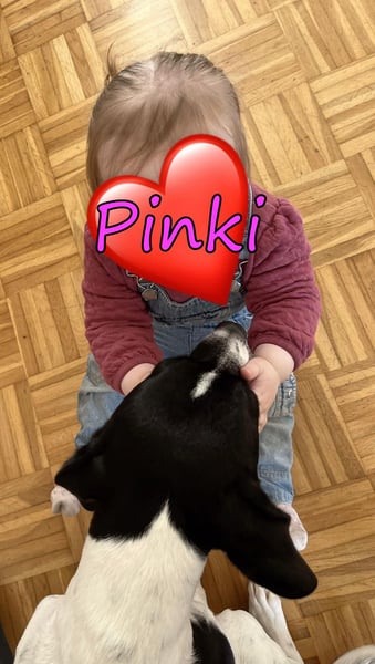 Unsere Tochter ist 13 Monate alt und Pinki zeigt sich im Alltag unglaublich liebevoll, vorsichtig und geduldig mit ihr. Wenn es ihr zu viel wird, zieht sie sich selbstständig auf ihren Platz zurück und kommt zur Ruhe ? wirklich vorbildlich.
