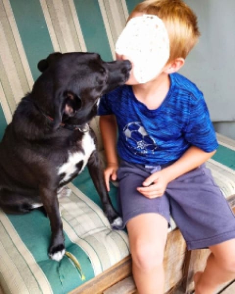 Nikulas hat sich inzwischen gut an die Enkelkinder der Pflegestelle gewöhnt und erkannt, wie man sich die meisten Leckerchen von ihnen abstauben kann. Bei fremden Kindern zeigt er sich noch zurückhaltend und fluchtbereit.