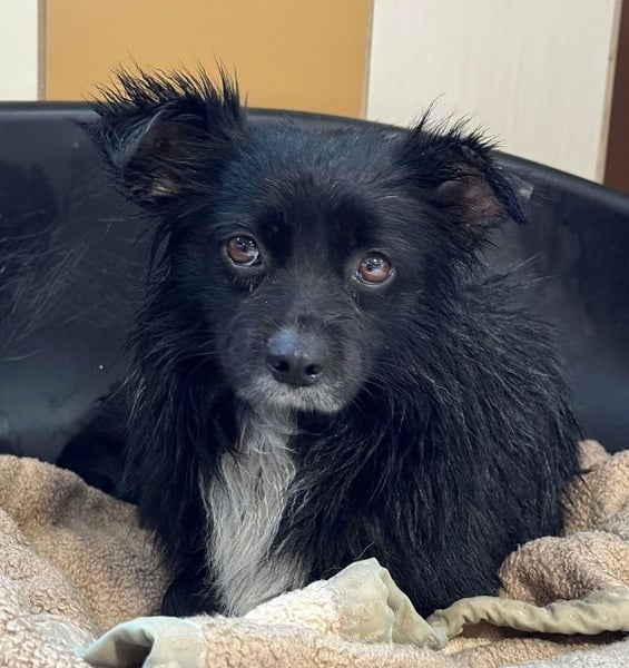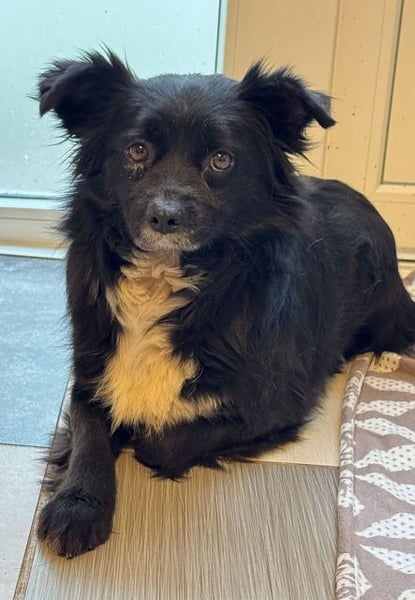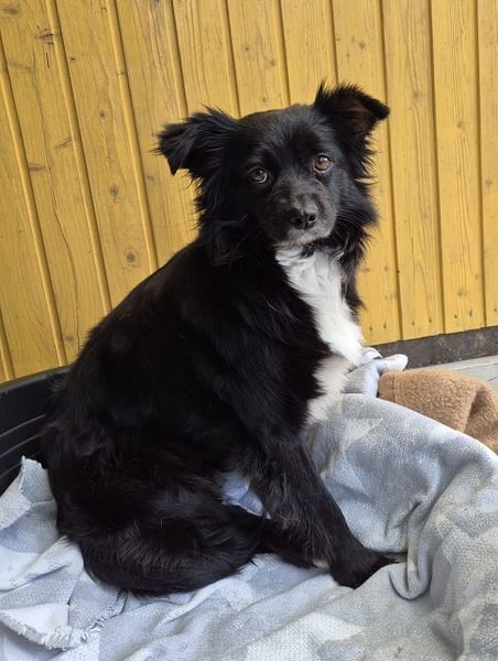 Zelda, eine kleine schwarze Hündin mit weißer Brust. Wie man uns erzählte, hat Zelda zunächst gebellt als die Kollegen den Auslauf betraten. Zelda ist noch unsicher und kennt den Kontakt zum Menschen offenbar kaum. Vorsichtiges Anfassen war möglich, genießen kann Zelda es jedoch noch nicht und zeigt deutlich, dass sie in ihrem Leben noch nicht viel menschliche Nähe erleben durfte. Wir gehen davon aus dass sie bereits Welpen gehabt hat. Sie braucht nun Menschen die ihr Zeit, Ruhe, Geduld und Liebe schenken, damit Zelda in ihrem eigenen Tempo ankommen kann. Und sie wird dies sicherlich mit ihrer Zuneigung zurückgeben. Sie lebt in einem gemischten Rudel und scheint verträglich. Zelda ist verträglich mit den anderen Hunden im Tierheim und wäre daher auch ohne Weiteres zu bereits vorhandenen Hunden vermittelbar. Aber auch als Einzelprinzessin wäre sie sicherlich sehr glücklich.
