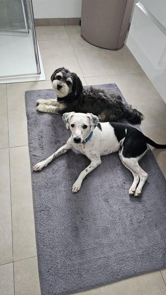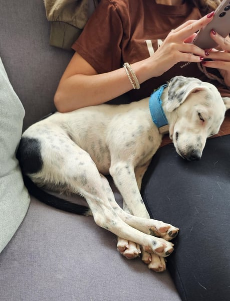 Mercy ist stubenrein und läuft bereits an der Leine und das Thema Auto fahren ist kein großes Problem.