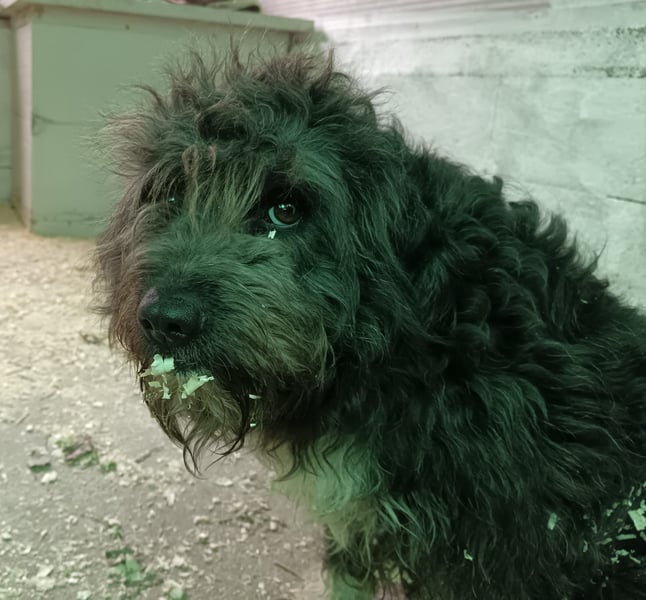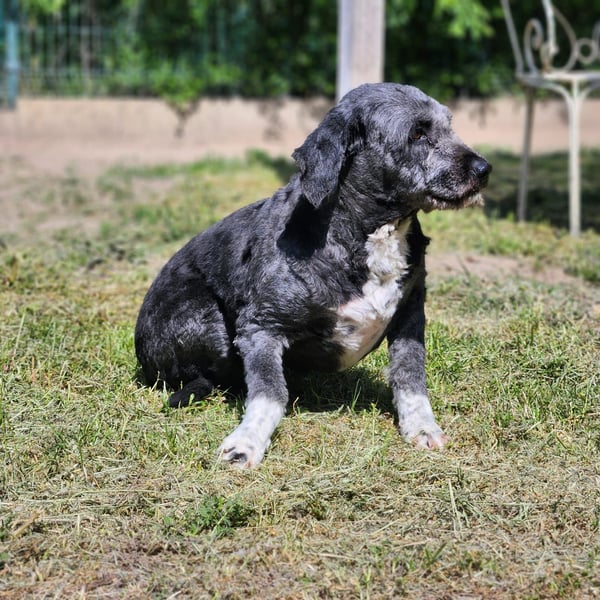 Maja wurde am Rand von Ballószög gefunden – ängstlich, jede Annäherung mit Knurren beantwortend. Ihr tiefes Misstrauen war so groß, dass man sie nur mit einer Lebendfalle in Sicherheit bringen konnte. Die Kollegen haben sie von ihrem verfilzten und mit Dreck verklebtem Fell befreit. Sie wurde geschoren.