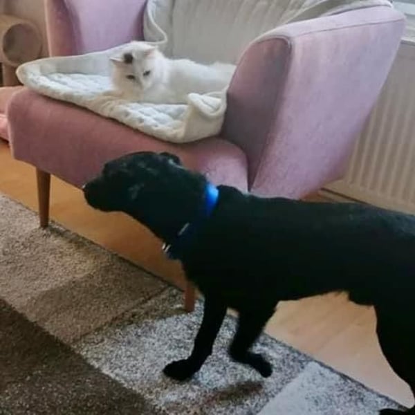 Er verträgt sich wunderbar mit Katzen, allen Hündinnen und allen kleinen Hunden. Große Rüden mag er nicht, die machen ihm Angst.