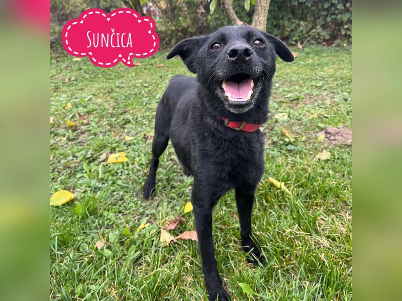 Sunčica (Sonnenschein) ist ein Mädchen, laut Tierarztschätzung ca. 2,5 Jahre alt (geb. 07.02.2023), wiegt 13 kg und ist 44 cm groß. Sie ist eine Mischlingshündin – sie wurde ohne Rute geboren.