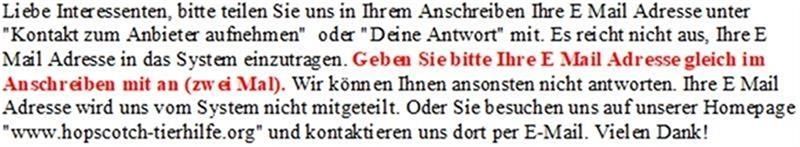 Tierschutz-Telefon: 030 805 806 57 (Bitte hauptsächlich per e-Mail anschreiben, da wir alle ehrenamtlich tätig sind und daher das Telefon nicht immer besetzt ist)