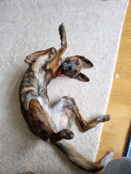 Sie wurde als ca. 6 Wochen alter Welpe verlassen auf der Straße gefunden und hat die folgenden Monate mit einem erwachsenen Rüden zusammen in einem Camper gelebt und von ihm viel gelernt, bis sie nach Deutschland kam.